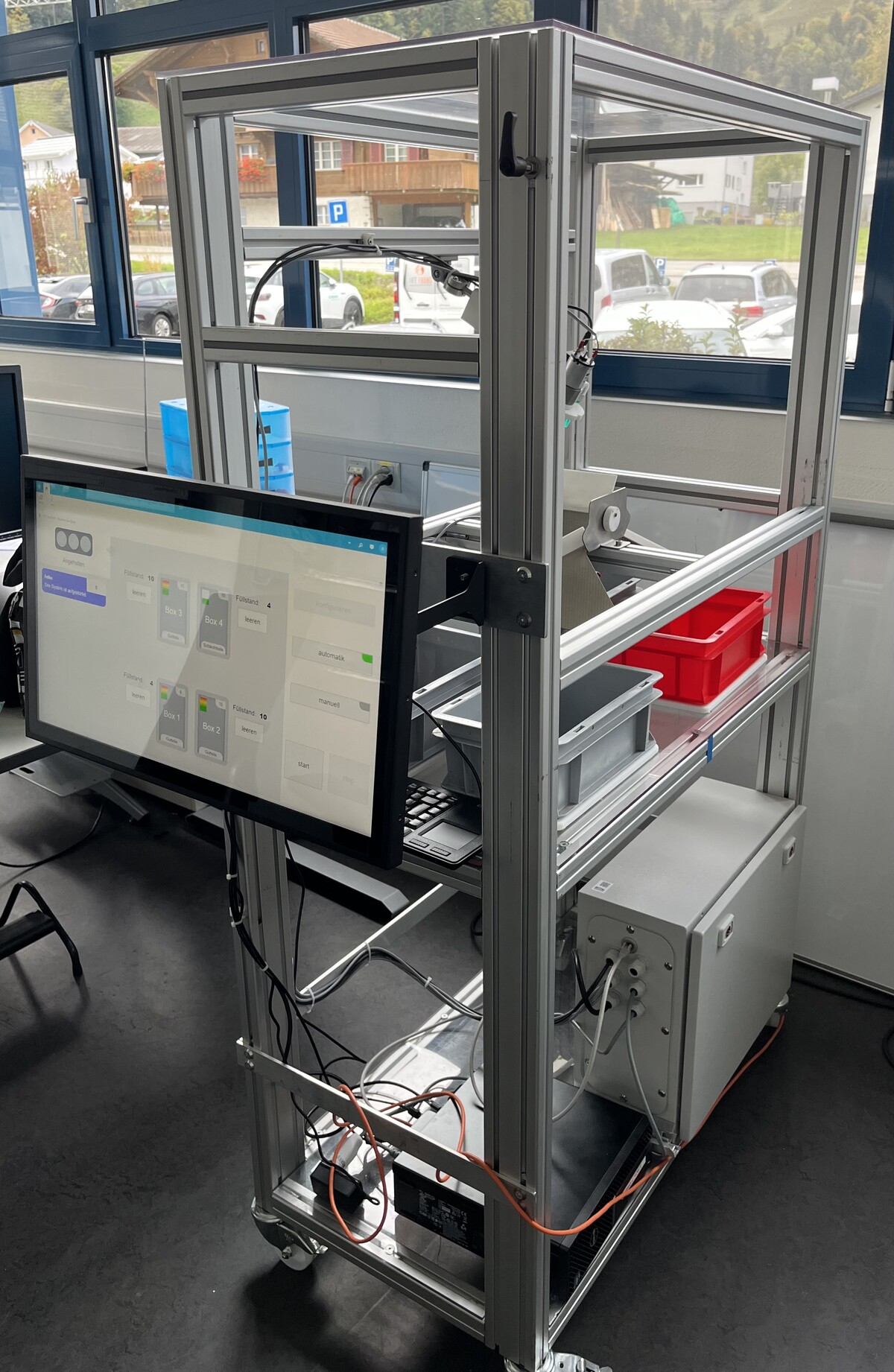 AusgangslageAn einem Produktionsstandort vom Unternehmen B. Braun wird ein Fertigungsleitsystem, engl. Manufacturing Execution System (MES), implementiert. Die Produktionsmaschinen vom Unternehmen werden in Zukunft im MES integriert. Dadurch werden sich einige Arbeitsabläufe für Produktionsmitarbeitende verändern. Um den neuen Umgang mit den im MES integrierten Produktionsmaschinen zu trainieren, wurde vom Unternehmen eine separate Maschine entwickelt, welche dies ausserhalb vom realen Produktionsumfeld ermöglicht.ProjektumfangIn diesem Projekt wurde die Automatisierungsebene und die Benutzeroberfläche für die oben beschriebene Maschine entwickelt. Die Automatisierungsebene musste dabei mit einer Schnittstelle zum MES ausgelegt werden. Zusätzlich mussten Teile von einem spezifischen Automatisierungs-Modul vom MES, namentlich Connect IoT, verwendet werden.LösungFür die Implementierung der Automatisierungsebene wurde ein Ansatz gewählt, bei dem die gesamte Steuerungs- und Prozesslogik des Systems zentral im Connect IoT Modul vom MES verwaltet werden können. Die Ausführung der Steuerungs- und Prozesslogik findet jedoch dezentral auf einem Edge-Client statt. Die Automatisierungsebene wurde folglich mit einer Edge-Computing Architektur implementiert. Die Automatisierungsebene kommuniziert über OPC UA mit den mechanischen Komponenten der Maschine.Die Benutzeroberfläche wurde als Web Page in HTML, CSS und Java Script entwickelt. Die Web Page kommuniziert über das Protokoll MQTT mit der Automatisierungsebene und wird auf dem oben erwähnten Edge-Client dezentral gehostet.