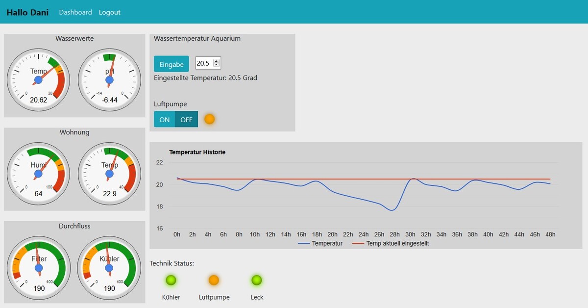 In diesem Projekt wurde ein Aquariencomputer erstellt, der sich zu vergleichbaren Produkten am Markt mit geringeren Kosten hervorheben kann. Der Aquariencomputer, der aus zwei Hauptelementen, einem Raspberry Pi und einem Arduino besteht, ermöglicht die Steuerung des Aquariums übers Web. Die Steuerung beinhaltet einen automatisierten Kühler und eine Luftpumpe, die sich ein und ausschalten lässt. Ebenfalls werden im Aquarium mittels Sensoren die Wassertemperatur, pH-Wert, Durchflussrate von Filter und Kühler, Stromaufnahme Filter und Kühler, Luftfeuchtigkeit, Umgebungstemperatur und der Wasserstand aufgezeichnet und in einer MySql-Datenbank abgespeichert, um diese in einem Web-Gui auszugeben, oder Alarme per E-Mail zu generieren falls ein Grenzwert überschritten wird. Das Web-Gui ist durch eine Login und Registrier-Seite gegen Zugriff von Drittpersonen geschützt.