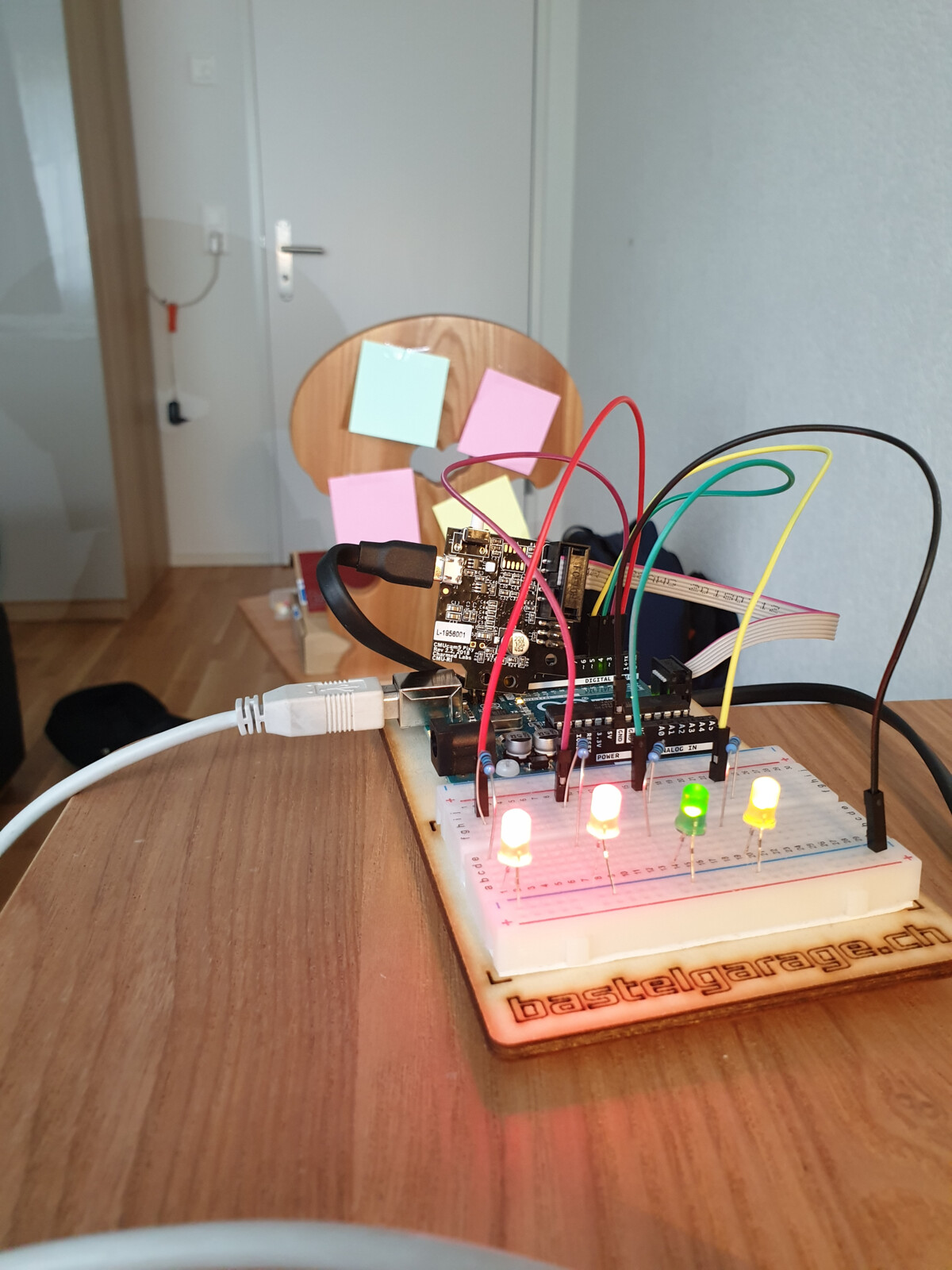 Auf dem Breadboard sind 5 gelbe LEDs verbaut. Jedes LED steht für einen Welpen. Das Grüne LED zeigt nur an, ob alle fünf Welpen detektiert werden. - Schalter