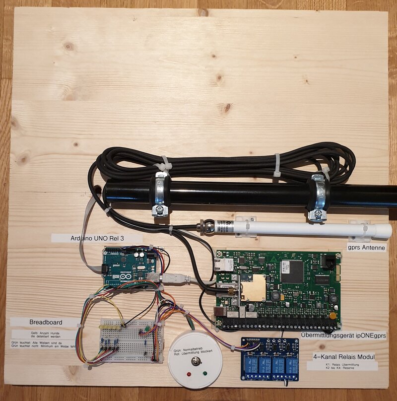 Das Übermittlungsgerät sendet bei einem Ausbruch eines oder mehrerer Welpen dem Kunden eine Alarm-SMS - gprs Antenne