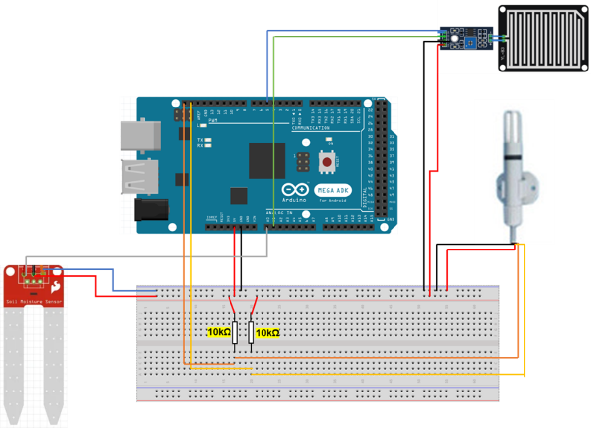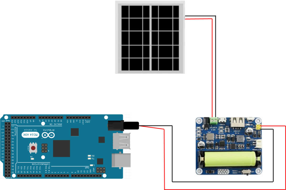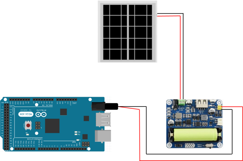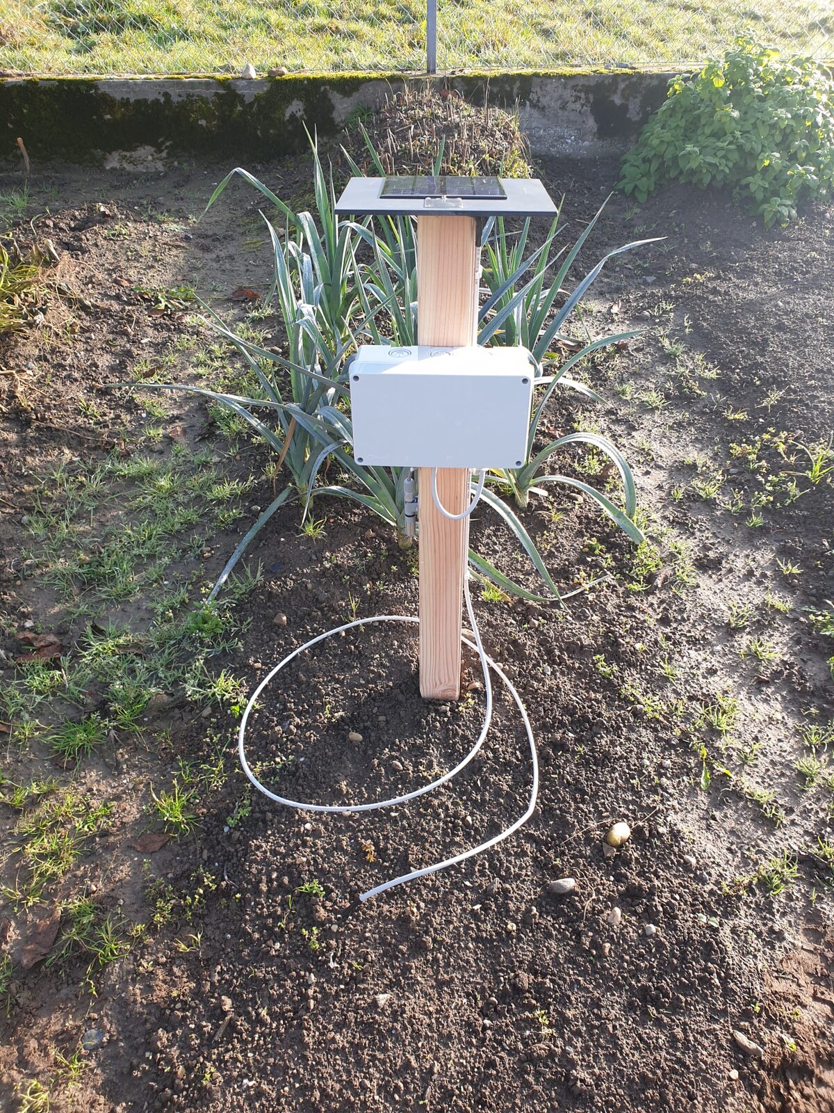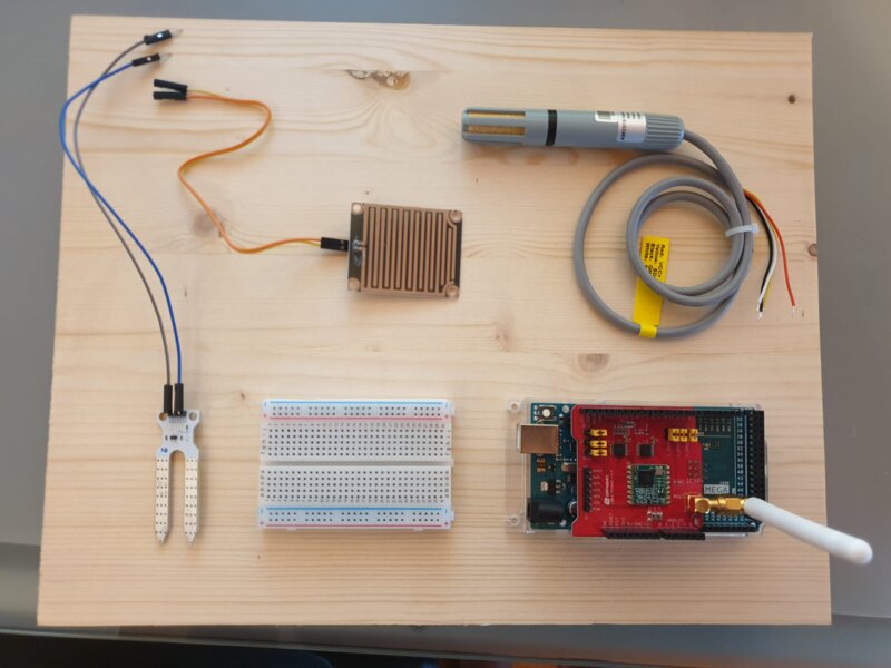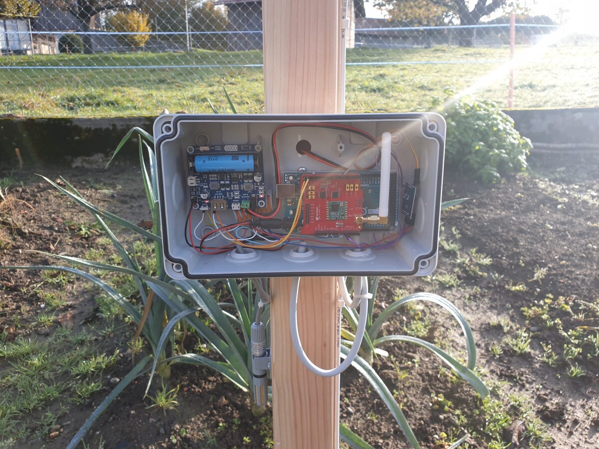 Es wird ein abgesetzter Sender im Garten installiert, welcher alle Sensorwerte (Temperatur, Luftfeuchtigkeit, Bodenfeuchtigkeit; Regen) detektiert und an den Empfänger in der Wohnung übermittelt. Die Aussenstation wird mit einem Arduino MEGA und einem Dragino-LoRa-Shield umgesetzt. Der Sender ist wetterbeständig gebaut und wird mit einer eigenen Stromquelle (Photovoltaik) versorgt.