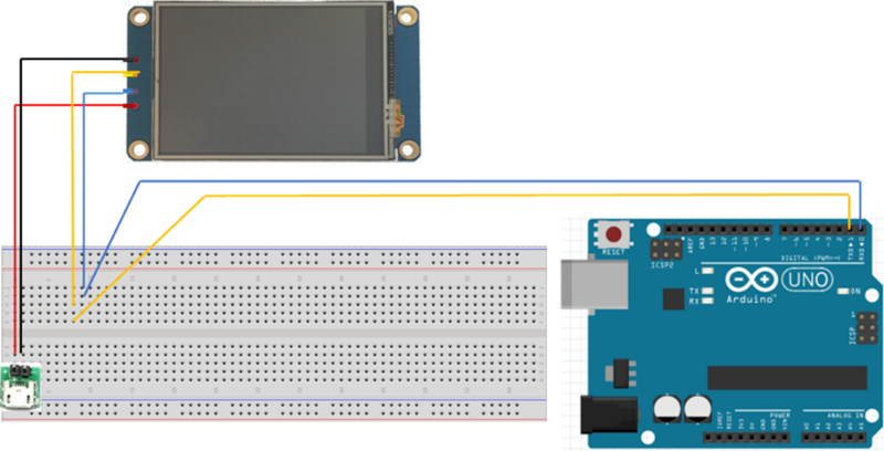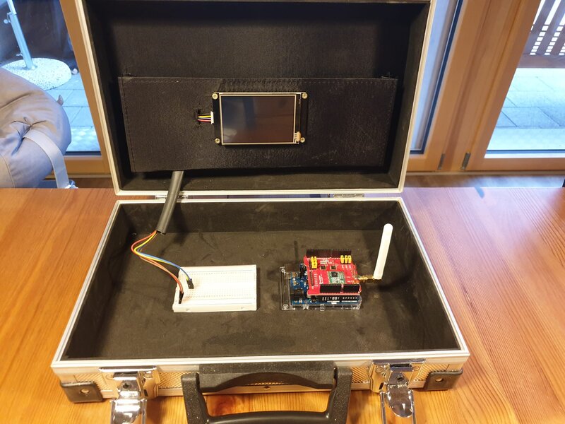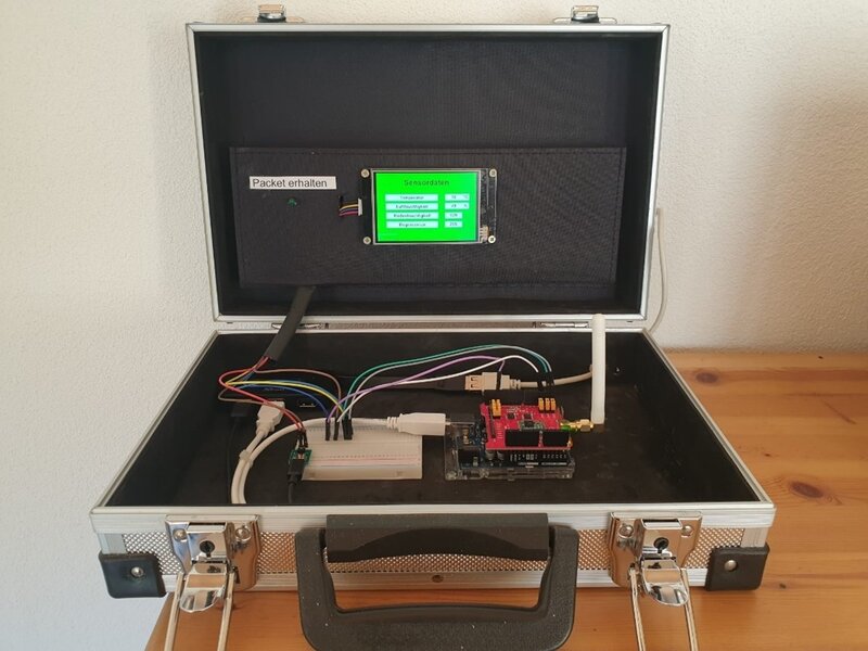 Der Empfänger wird mit einem HMI Nextion Touchdisplay Display versehen, auf welchem die verschiedenen Werte angezeigt werden. Die Station in der Wohnung ist mit einem Arduino UNO und einem Dragino-LoRa-Shield umgesetzt.