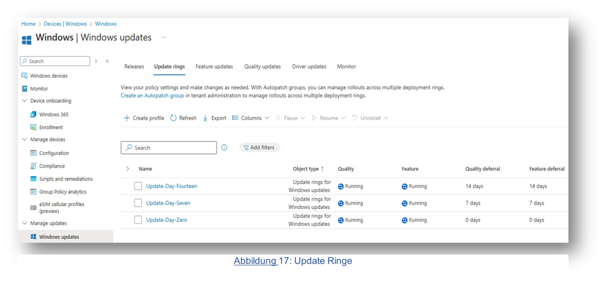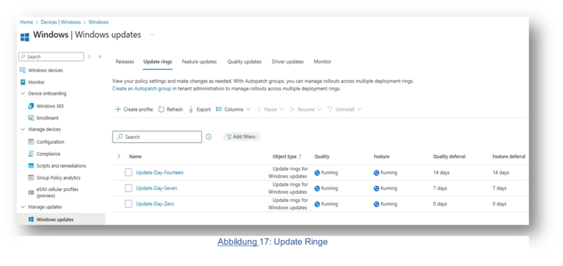 Im weiteren Verlauf wurde die neue Umgebung Schritt für Schritt aufgebaut und getestet. Dabei lag der Fokus auf einer stabilen, skalierbaren und sicheren Umsetzung: Server-Updates werden nun automatisch in drei Wartungsgruppen verteilt (nach 1 Tag, 4 Wochen und 6 Wochen), während Client-Updates in drei Intune-Ringen (Day 0, Day 7, Day 14) ausgerollt werden. So wird eine kontrollierte Einführung gewährleistet, die Risiken minimiert und Ausfallzeiten vermeidet.