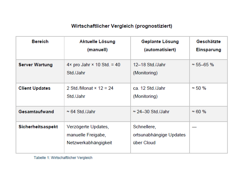 Mit der neuen Lösung konnte der jährliche Administrationsaufwand um rund 60 % reduziert werden. Server und Client Updates laufen nun automatisiert im Hintergrund, wodurch IT-Mitarbeitende wertvolle Zeit für strategische Projekte gewinnen. Gleichzeitig wurde die IT-Sicherheit deutlich erhöht, da Systeme nun stets aktuell und geschützt bleiben.
