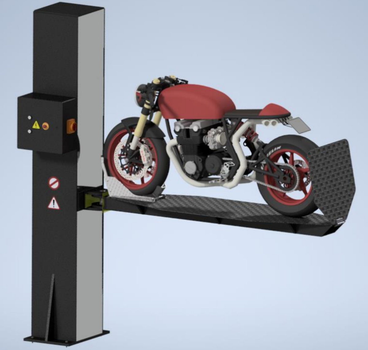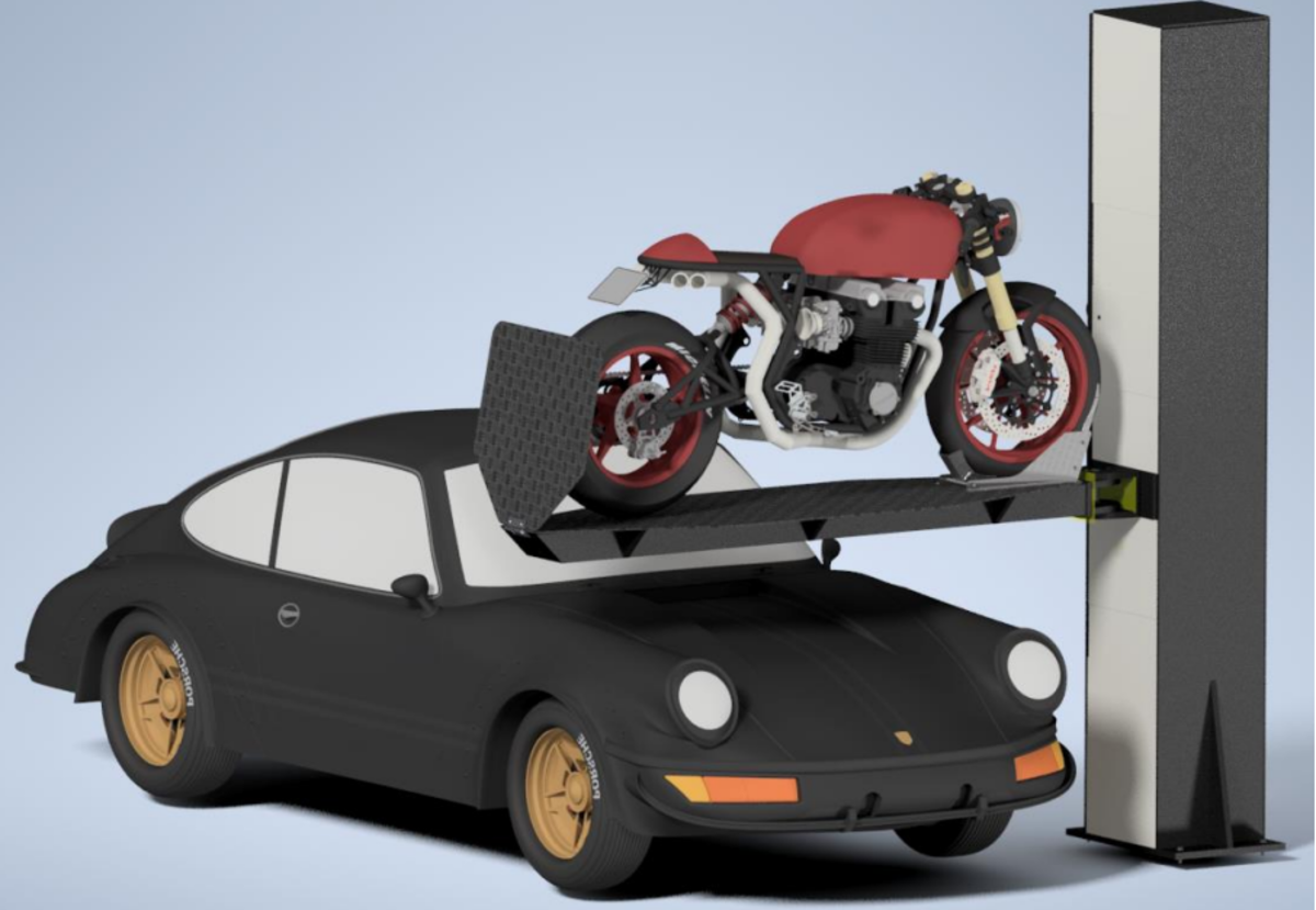 Die hier vorliegende Lösung soll Probleme wie Platzmangel beseitigen. Weiter kann das Motorrad ein- und ausparkiert werden ohne das Auto zu versetzen. Ausgelegt wurde der Motorradparklift für Motorräder bis zu 300 kg und einer Länge von 2'000 mm. Zudem verfügt dieses Liftsystem über eine maximale Hubhöhe von 1'500 mm.