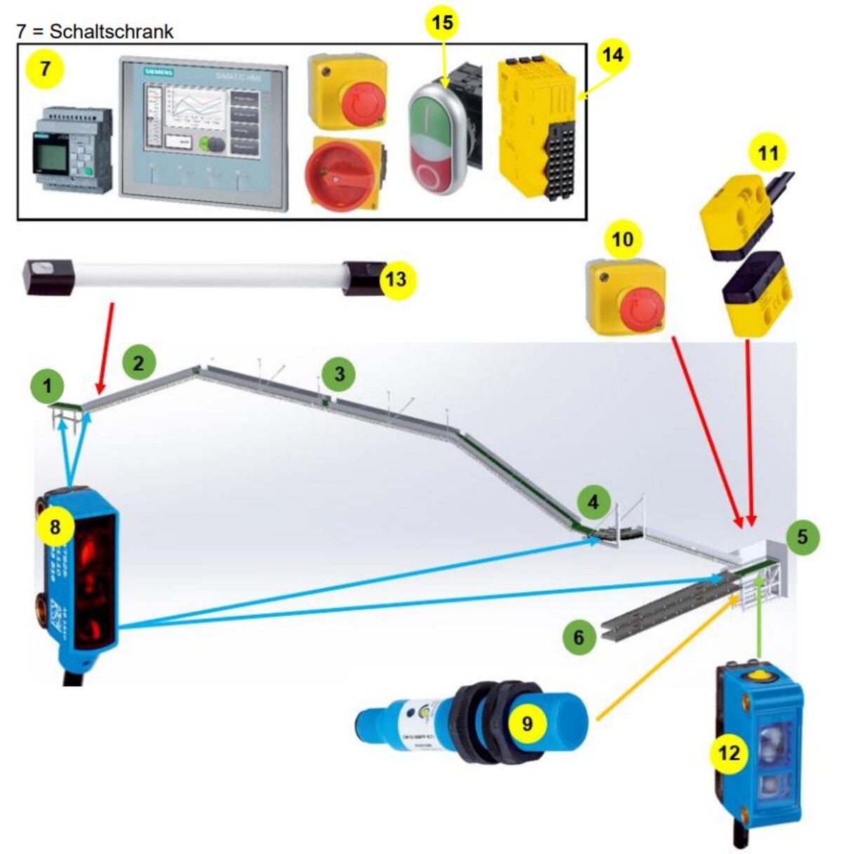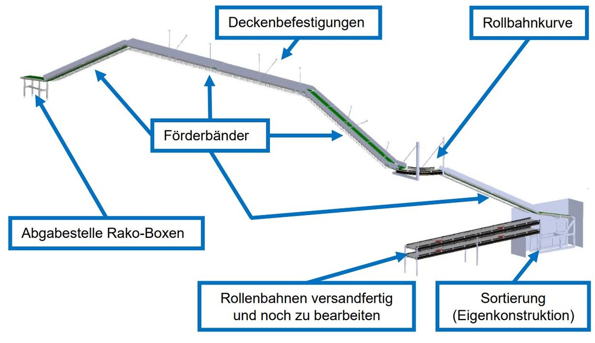 Beim vorliegenden Konzept wird das Transportgut (Rako-Box), welches in zwei verschiedenen Farben (versandfertig / noch zu bearbeiten) vorliegen kann, bei der Abgabestelle auf ein Förderband übergeben. Sensorgesteuert startet die Anlage schrittweise und befördert die Box über ein Steigband und zwei horizontale Bänder sowie über ein geneigtes Band zu einer Rollbahnkurve. Nach der Kurve gelangt die Box über ein weiteres geneigtes Band zur Sortiereinheit. Mittels Farbsensor wird zwischen versandfertig und noch zu bearbeiten unterschieden und jeweils automatisch auf die zwei Auslaufrollenbahnen sortiert.