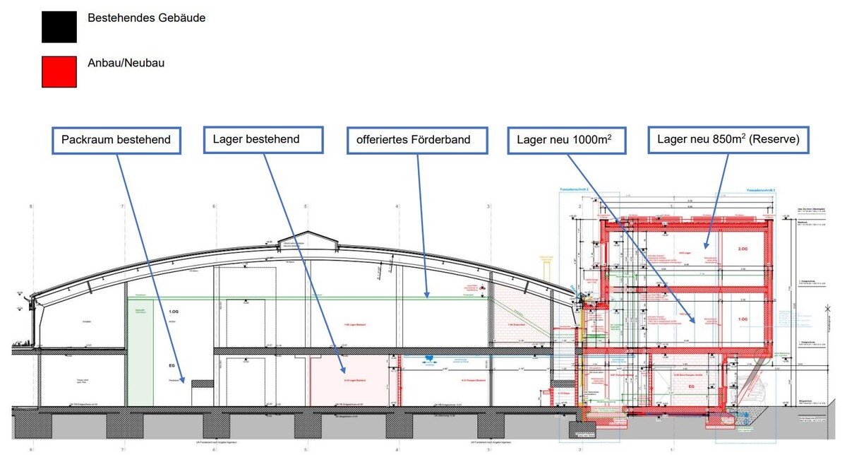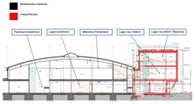 Zurzeit werden pro Tag rund 140 Aufträge im Lager in Rako-Boxen gerüstet, im Packraum verpackt und schweizweit versendet. Einige Artikel werden vor dem Versand um- oder zusammengebaut und nach Kundenwunsch hergestellt. Zudem versendet die Firma auch reparierte Kleinteile per Post. Daher ist vorgesehen, den Packraum im EG am bestehenden Standort zu belassen. Aufgrund der stetig wachsenden Menge an Bestellungen per Onlineshop und dem neu zweistöckigen Aufbau wird eine Lösung gesucht, die versandfertigen Positionen laufend in einen zentralen Packraum zu bringen. Die gesuchte Lösung muss daher die ganze bestehende Stahlhalle queren sowie eine Stockwerkdifferenz ausgleichen. Der Geschäftsführer der Firma hat im Vorfeld dieser Arbeit eine Offerte für ein Fördersystem eingeholt. Dieses arbeitet mit Förderbändern und automatisiertem Vertikalaufzug. Da die offerierte Anlage jedoch das Budget bei weitem übertrifft, wurde der Diplomand beauftragt, Alternativen zu suchen.