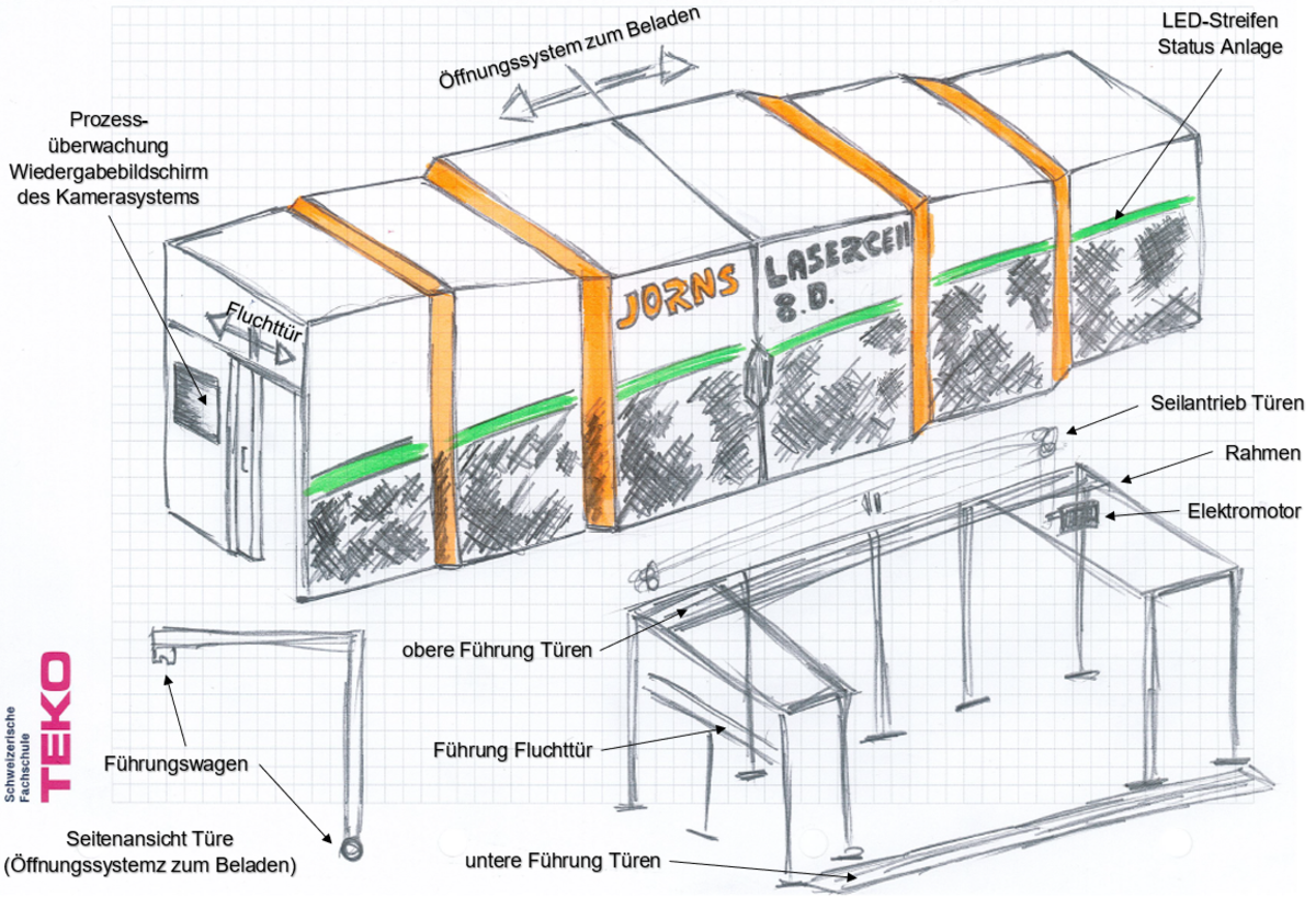 Demnach entwarf und konstruierte ich mit meinem Arbeits- und Schulkollegen eine komplette Laserhärtanlage, die auf unsere Anwendung zugeschnitten wurde, im fünften Semester an der Schule TEKO in Olten als Semesterarbeit. Die Geschäftsleitung entschied sich, das Projekt weiterzuverfolgen. Bei der Anlage wird ein Laser TruDisk 6001 der Firma Trumpf, mit einer Leistung von 6’000W eingesetzt. Direkte Bestrahlung der Teile, sowie auch Streustrahlung solcher Laserquellen mit dieser Leistung stellen eine potenzielle Gefahr für Haut und Auge dar und müssen vollständig abgeschirmt und mit einem Gehäuse umschlossen sein, so dass keine Strahlung nach aussen gelangen kann.