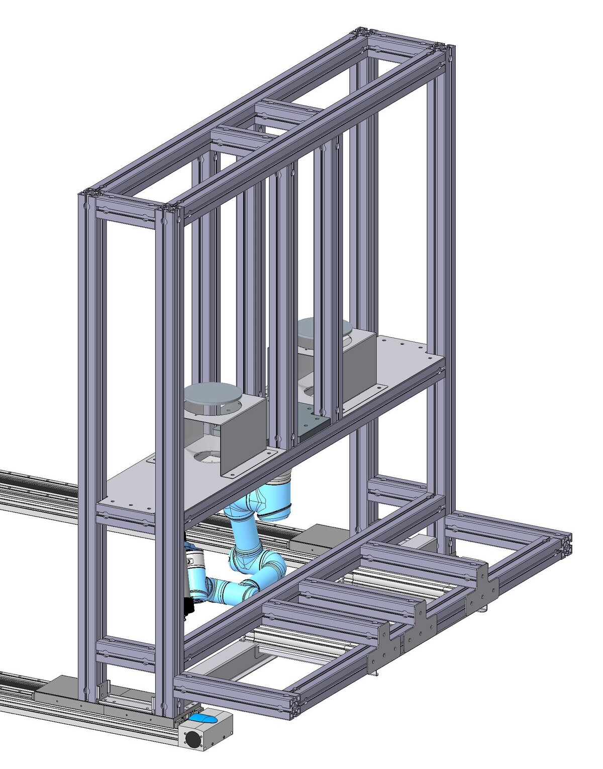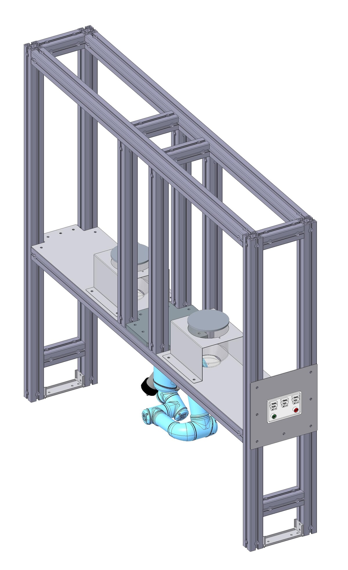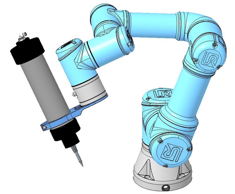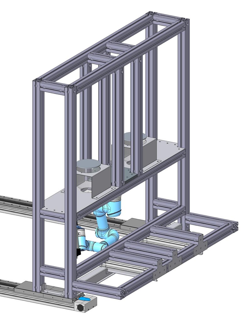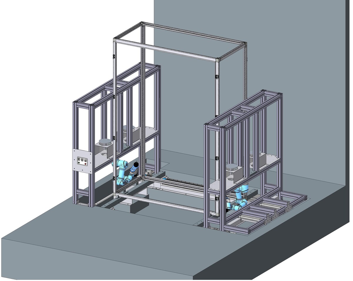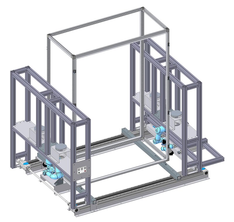 Die Lösung der automatisierten Eckstückabdichtung ist an einer Definierten Stelle in der Produktion zu platzieren. Der linke der Teil der Anlage ist starr. Der rechte Teil der Anlage wird durch das Bedienelement mittels Linearführungen auf die richtige Position bewegt. Die Befestigung des IP55 Gestells erfolgt über Pneumatik Zylinder. Diese haben ein integriertes Messsystem, um die Toleranzen des Gestells zu erkennen und die Differenz an die abzudichtenden Gelenkroboter zu übertragen. Es sind zwei Gelenkroboter von UNIVERSAL ROBOTICS verbaut, welche beide Seiten des IP55 Gestells abdichten.