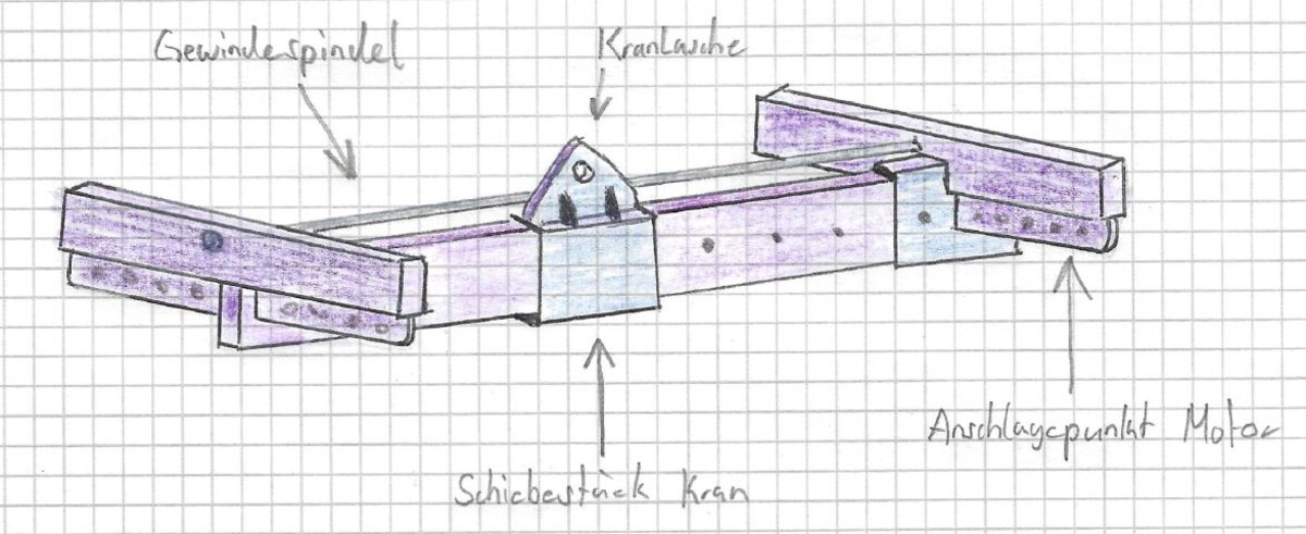 Die Motore werden mithilfe eines Portalkrans angehoben und verbaut. Durch die Neukonstruktion einer mit dem Kran kompatiblen Lasttraverse konnte eine passende Lösung gefunden werden. Die Traverse kann mittels Laserteilen und vorhandenen Standardbauteilen hergestellt werden. Unter Berücksichtigung der EN-Normen wurde nach den heutigen Standards entwickelt und entworfen.