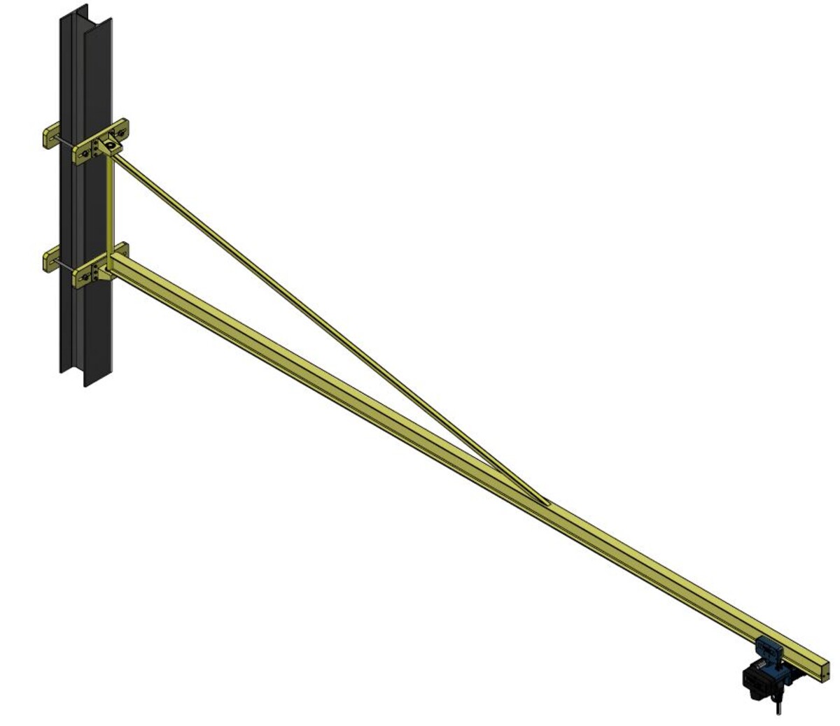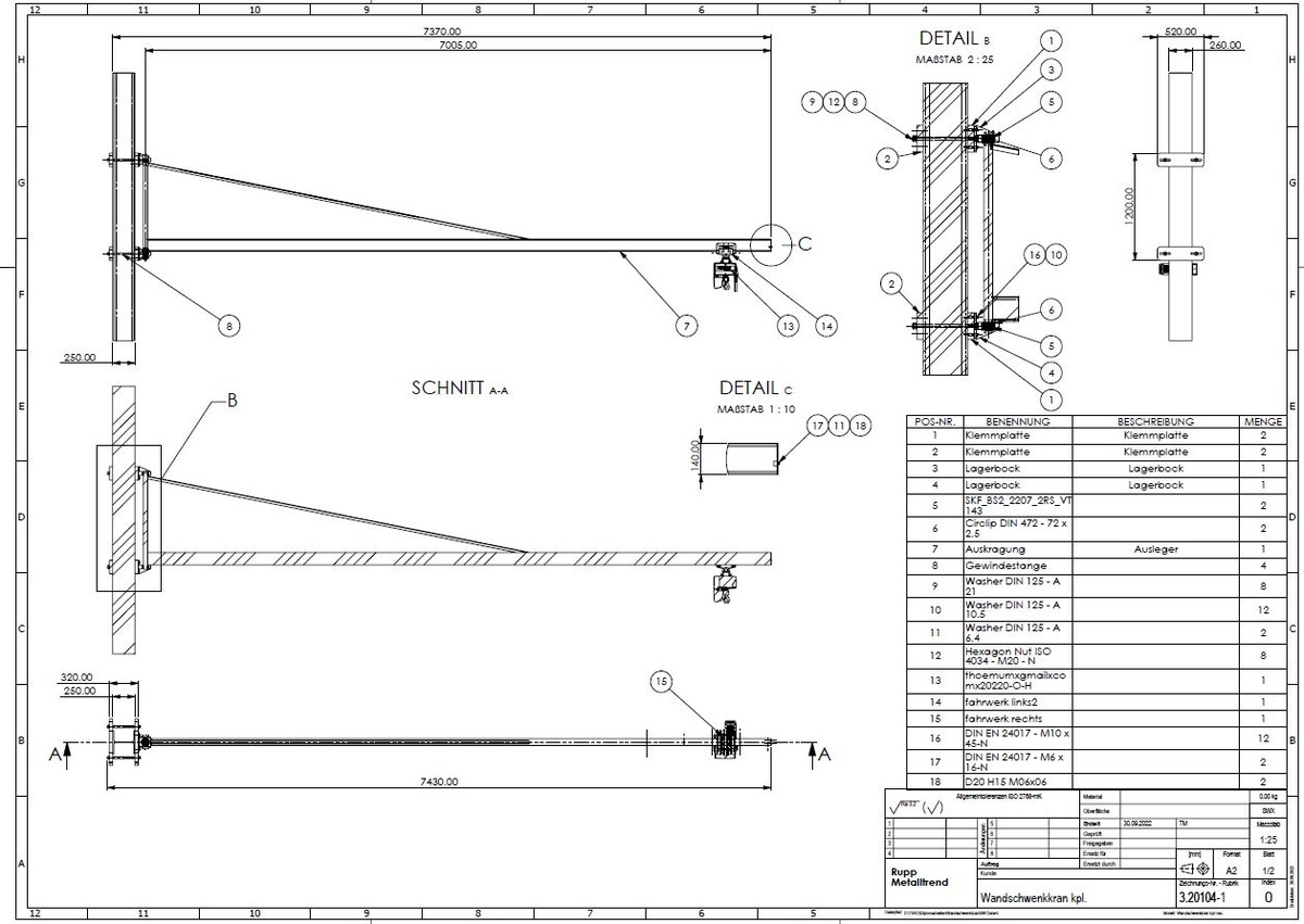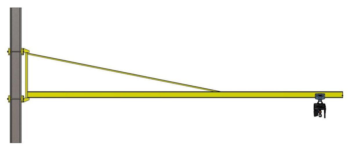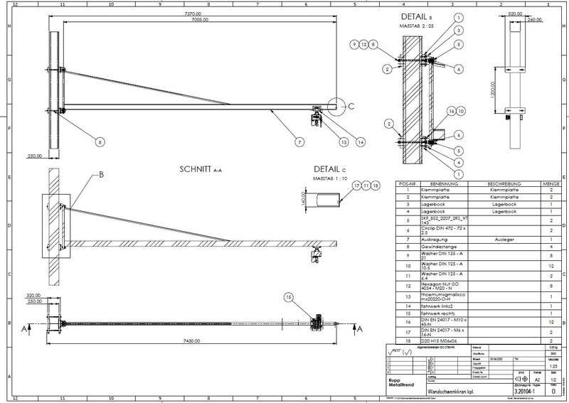 Der Wandschwenkkran wird mit einer Umklammerung an den vorhandenen Hallenträger montiert. Auf die Umklammerung werden die Lagerböcke mit je sechs M10 Schrauben verschraubt. Der Ausleger mit der angeschweissten Drehachse wird in die Lager eingeführt und gefettet. Nach der Montage der Stahlteile wird die Stromzuführung angebracht. Auf das IPE 140 Trägerprofil wird das Fahrwerk mit dem Kettenzug montiert. Der Wandschwenkkran ist für eine Last von 250 kg ausgelegt. Das Bediengerät der Laufkatze hat eine NOT-AUS Funktion. Am Ende des Trägerprofil wurden zwei Gummipuffer angebracht.