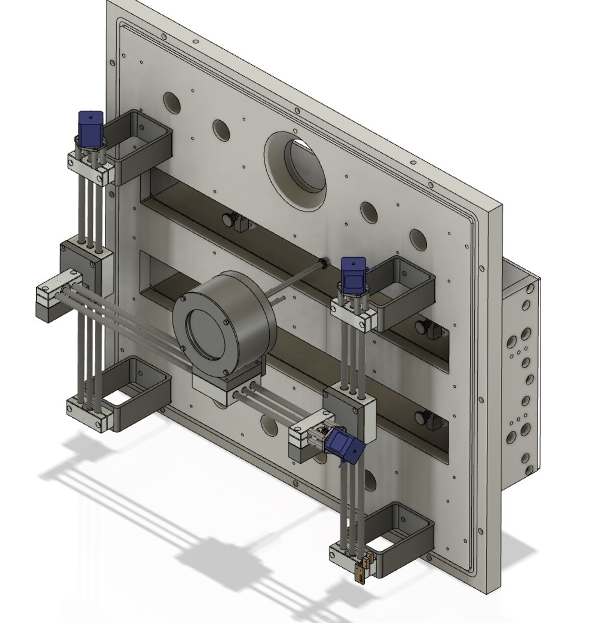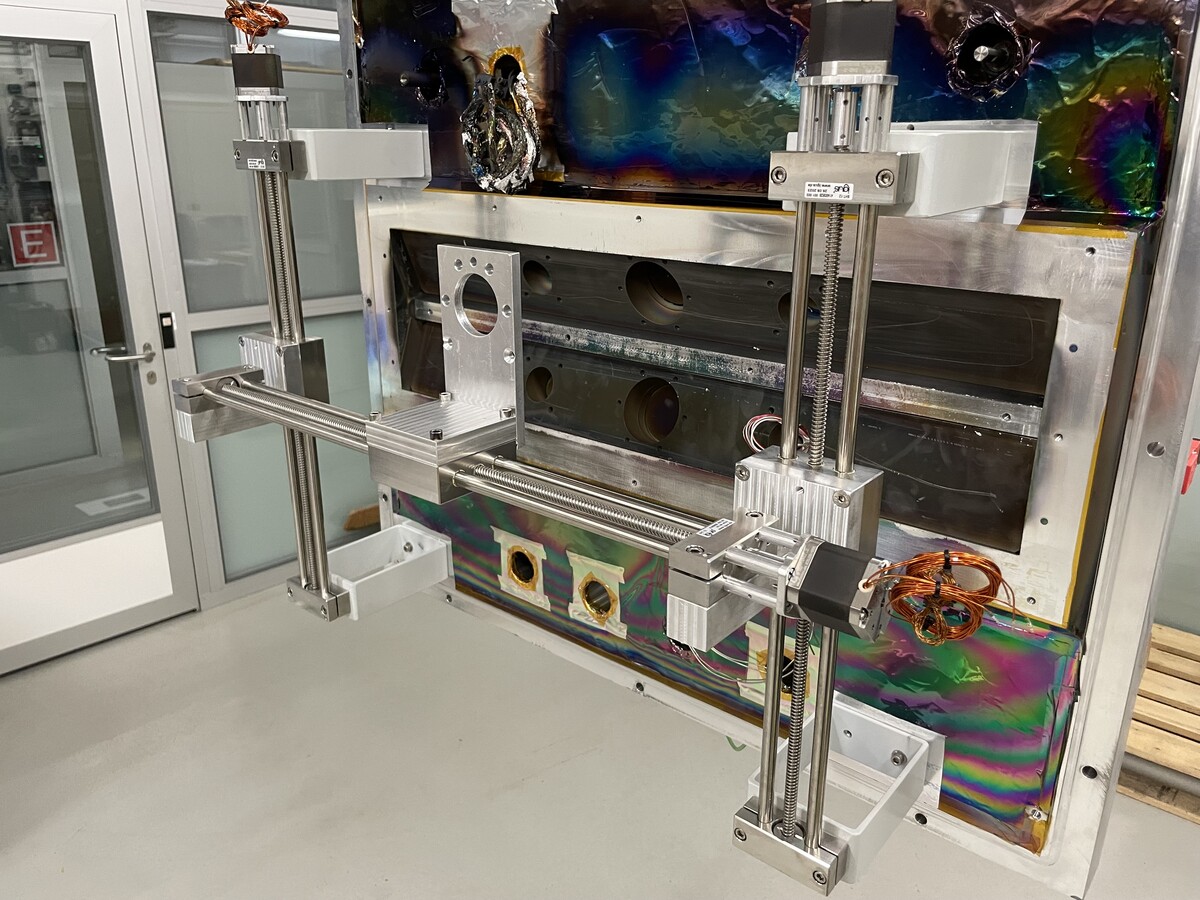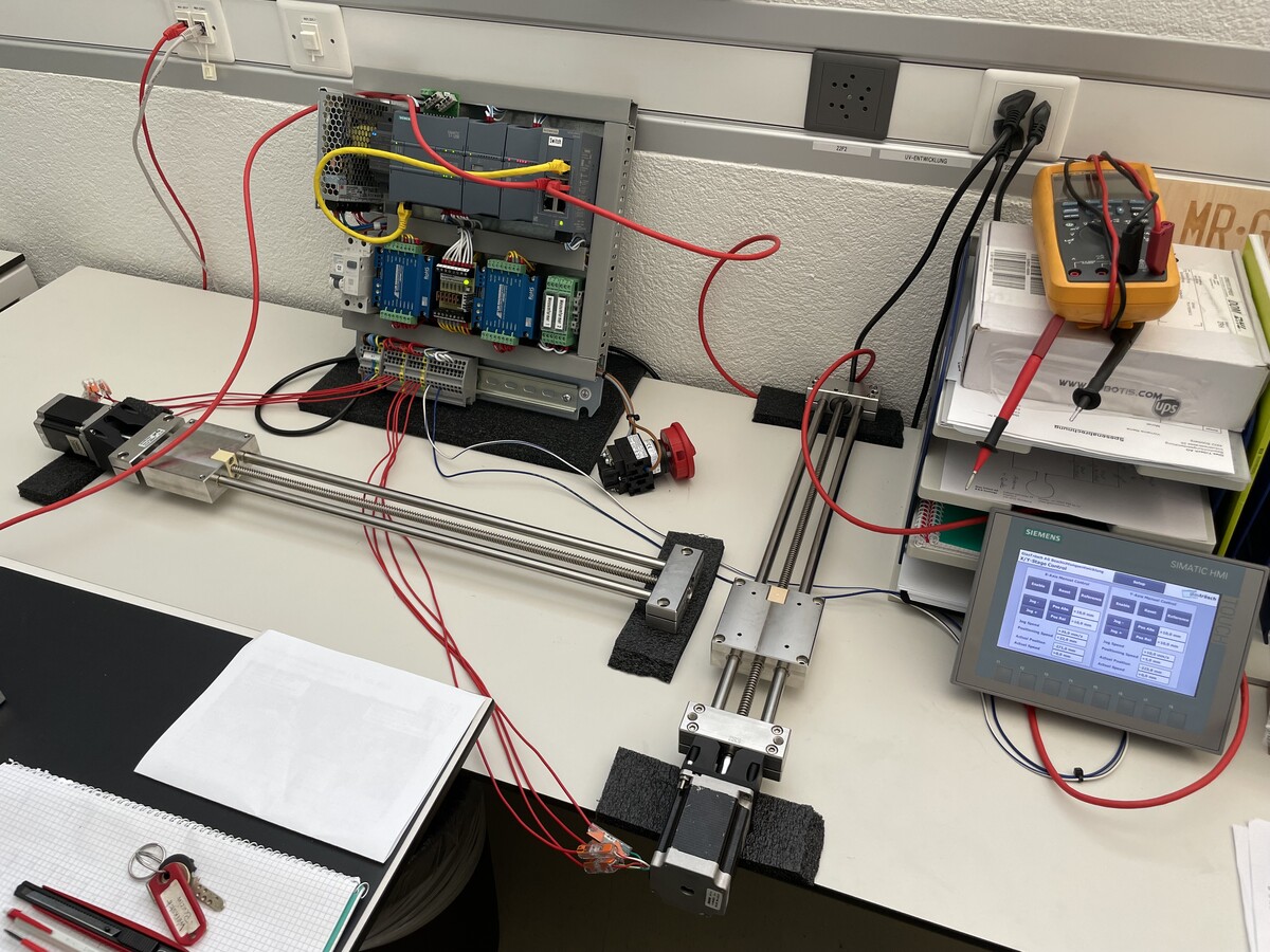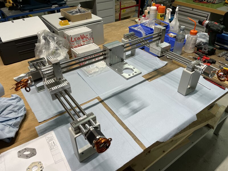 Die Linearführungen wurden bei IGUS bestellt, sind eine Spezialanfertigung und komplett aus rostfreiem Stahl gefertigt. Angetrieben werden die Achsen von vakuumtauglichen Schrittmotoren. Gesteuert wird wird die Positionierung mit einer Siemens S7-1200 SPS. Als Bedieninterface dient ein Siemens KTP700 Touch-HMI.