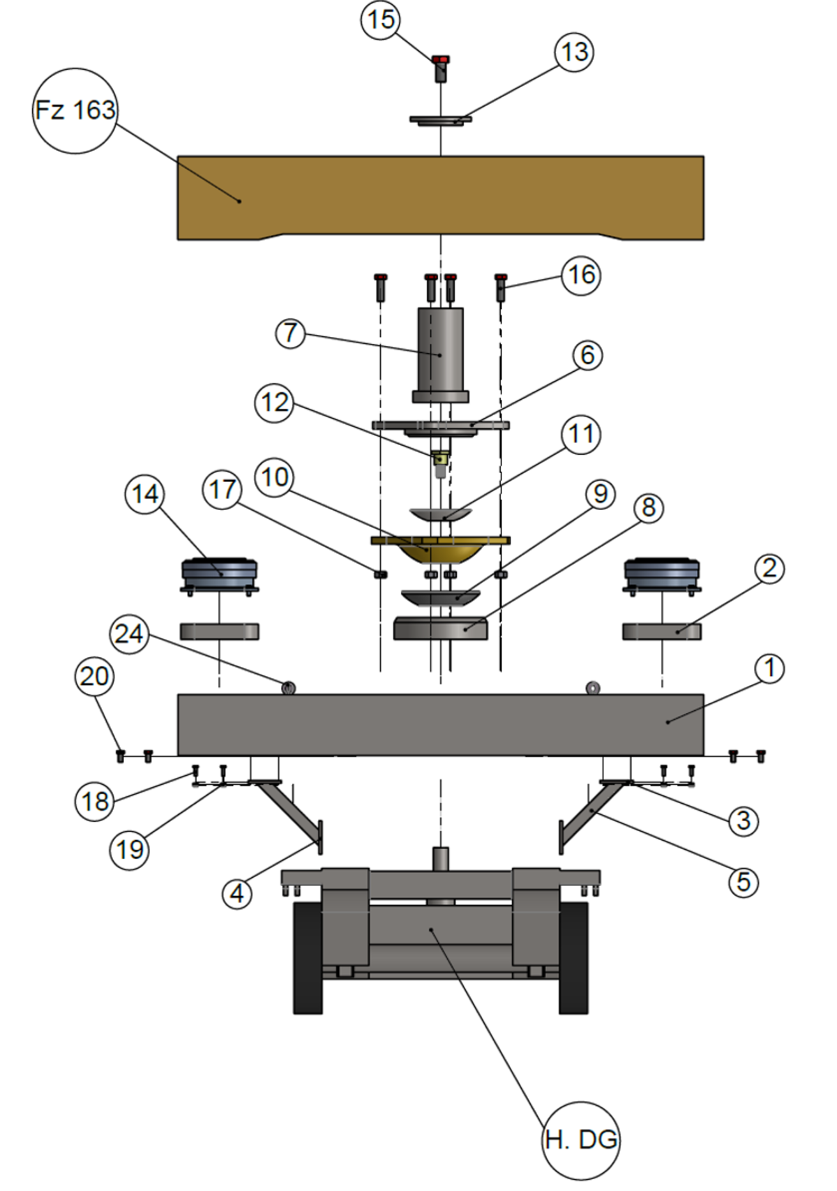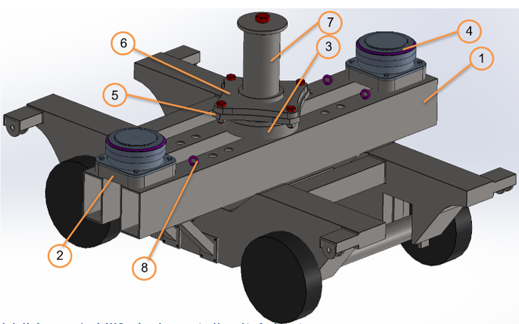 EinleitungZum Abschluss der Ausbildung zur Technikerin HF Maschinenbau wurde eine Diplomarbeit erarbeitet. Bei der Themenwahl war für mich zentral, ein Praxisbezogenes Projekt zu wählen bei dem ich mein erlerntes Wissen, welches ich mir in den letzten sechs Semester angeeignet habe, umsetzen kann. Der Regionalverkehr Bern-Solothurn betreibt neben den Personenzügen auch eine Dienstfahrzeugflotte für den Bau und der Unterhalt der Bahntrassen und Infrastrukturbauten. Auch an diesen Fahrzeugen muss periodisch eine Revision vorgenommen werden. Auf das Fahrzeug, welches ich mich in der Diplomarbeit beziehe, ist das Fahrleitungsfahrzeug 163. Dieses Fahrzeug wird im Jahr 2025 im Depot Worbboden revidiert. An dem Fahrzeug werden unter anderem die ganzen Drehgestelle demontiert. So ist das Fahrzeug nicht mehr mobil und kann nicht auf dem Areal verschoben werden. In der Diplomarbeit befasse ich mich damit eine Lösung für die Mobilität durch die Revisionszeit das Fahrzeuges zu finden. Es stehen in der Werkstätte zwei Rollschelmeldrehgestelle (Hilfsdrehgestell) bereit. Die Rollschemeldrehgestelle sind alte Drehgestelle, welche nicht mehr für den Betrieb verwendet werden. Sie dienen nur noch als Hilfsdrehgestelle. Die Idee ist es einen Adapter zu entwerfen und auszulegen der auf die Hilfsdrehgestelle sowie auf das Fahrleitungsfahrzeug 163 passt. Es sind Folgende Ziele definiert: -Der Adapter muss eine statische Belastung von 46 Tonnen aufnehmen können -Die Gesamtkonstruktion darf nicht höher als das originale +100mm sein -Vollständige Dokumentation -Einhalten des Budgets Lösungsvorschlag Der Lösungsvorschlag ist, ein Adapter aus verschiedenen Komponenten herzustellen. Die Basis des Adapters ist der Querträger (1). Der Querträger besteht aus zwei vierkantprofiele und wird auf das Drehgestell geschraubt. Auf den Querträger werden die Distanzplatten (2) für die Federtöpfe (4) und der Drehpfannenunterteil (3) geschweisst. Die Drehpfanne (5) wird auf den Unterteil montiert und mit dem Grundhalter (6) für den Zylinder (7) verschraubt. Der Zylinder ist in die Grundhaltung eingeschweisst und ist der Drehpunkt des Fahrzeuges. Die Gewichtskraft des Fahrzeuges wirkt auf die Federtöpfe, welche auf den Distanzplatten montiert sind. Damit der gesamte Adapter leicht montiert und demontiert werden kann, sind am Querträger Ringschrauben (8) montiert. So kann die Baugruppe mittels Krans bewegt werden. Mit diesem Lösungsvorschlag sind alle Ziele erfüllt und das Budget kann eingehalten werden.