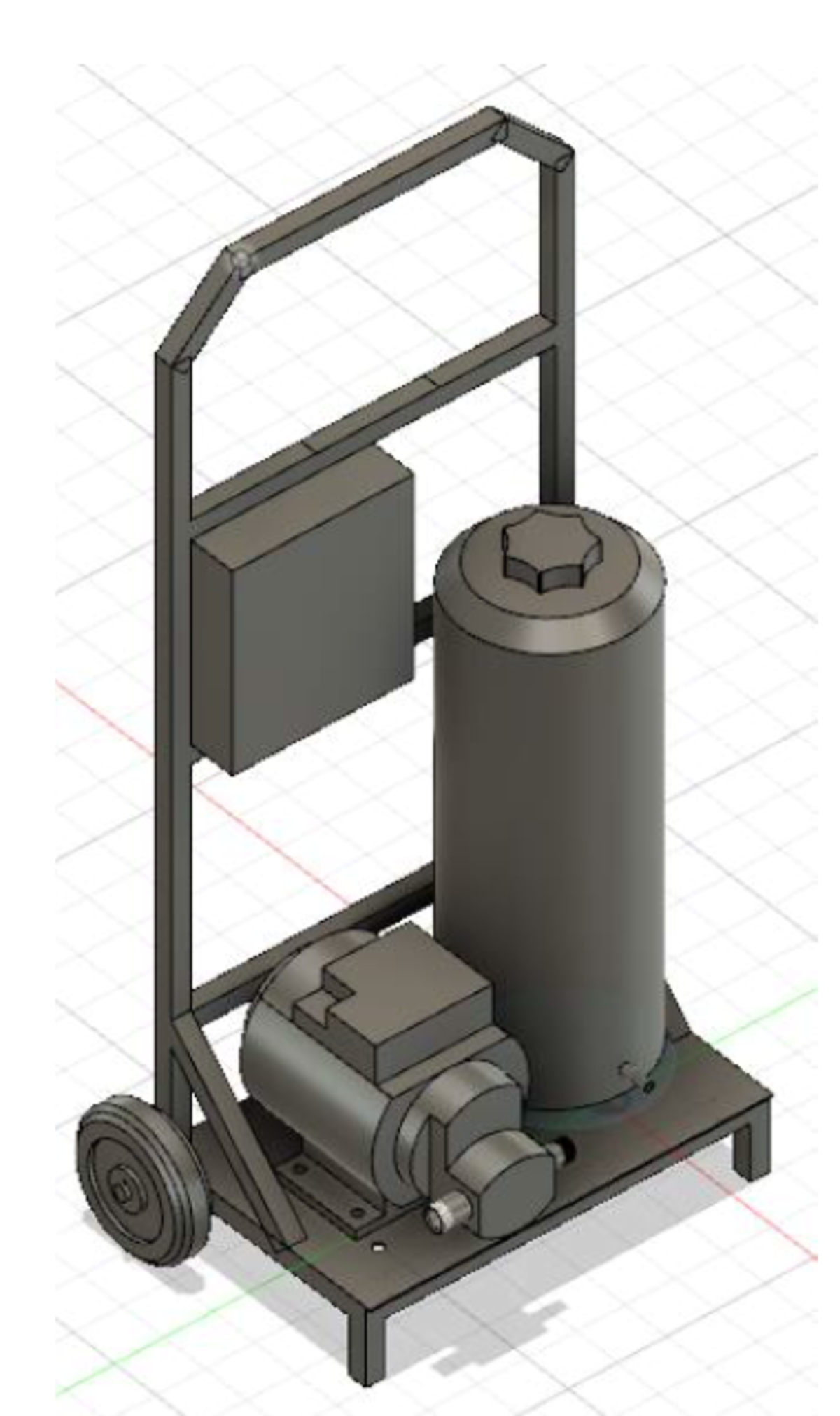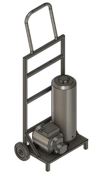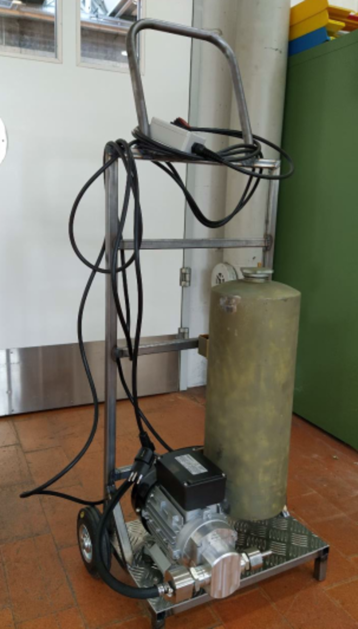Für den Lösungsvorschlag werden die Pumpen EP 100 und Marco UPX verwendet. Beide Pumpen sind Zahnradpumpen und elektrisch über den Netzbetrieb angetrieben. Die Marco UPX ist mit FKM Dichtungen ausgestattet. Sie leistet sechs bar und hat eine Fördermenge von 10l/min. Die EP 100 leistet acht bar und hat eine Fördermenge von 11l/min. Die zwei Pumpen werden auf dem Riffelblech montiert. Als Schwingungsdämpfer dienen Gummipuffer zwischen der Ölpumpe und dem Riffelblech. Der Öltank ist aus Stahl und beinhaltet ein Volumen von 11.7 Liter. Der Öltank wird mit vier M8 Schrauben direkt am Stahlrahmen befestigt. Das Gerüst wird mit Vierkant Stahlrohren 20mmx20mm geschweisst. Als Gerüstboden dient ein Riffelblech mit der Breite 410mm und der Länge 260mm. Es werden zwei Vollgummiräder mit dem Durchmesser 140mm verwendet. Die Räder sind an einer Stahlwelle mit dem Durchmesser 15mm und der Länge von 500mm angeschraubt. Für das Transportieren des Öls sind Gummidruckschläuche vorgesehen, welche selbst zugeschnitten und mit Schlauchschellen befestigt werden. Für die Reinheit des Öls werden Hydraulikfilter verwendet. Um den Druck zu reduzieren sind Druckregulierventile mit integriertem Manometer eingebaut. Für die Entlüftung des Hydraulikschlauches sind Umschaltventile eingebaut, mit welchen das Öl zurück in den Tank geleitet wird. Die Fernschaltung der Schmierölpumpe funktioniert über einen Schalter, welcher in einem Boplagehäuse montiert ist und durch ein Kabel mit der Pumpe verbunden ist. Das Kabel hat eine Länge von drei Metern und kann somit problemlos ferngeschaltet werden. Die Gesamthöhe der beiden Produkte betragen 1200mm, die Breite 410mm und die Länge 260mm. Das Gesamtgewicht mit leerem Öltank beträgt 26kg für die Schmierölpumpe und 12.6kg für die Hydraulikölpumpe.