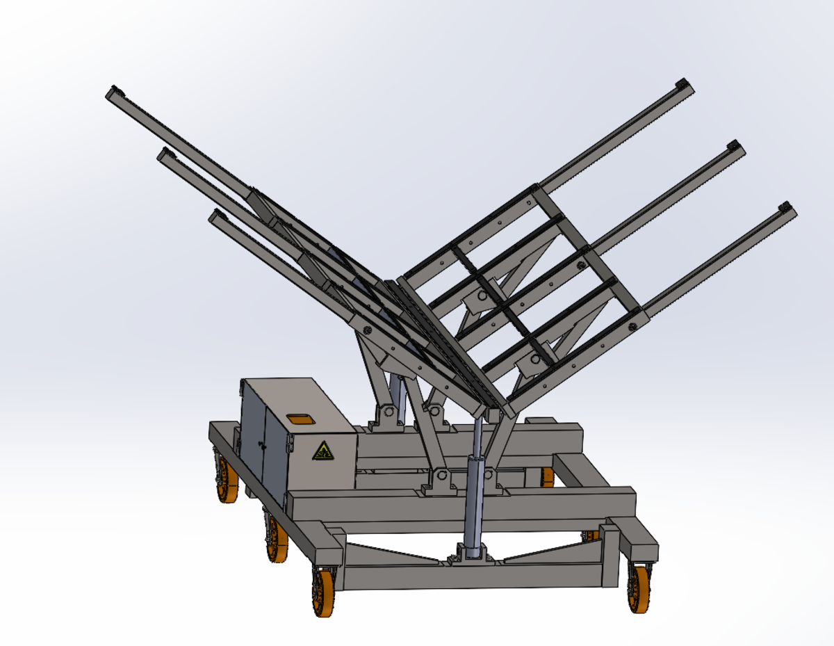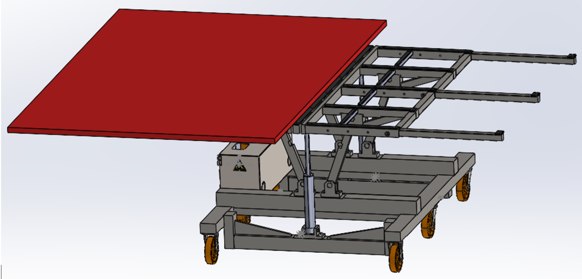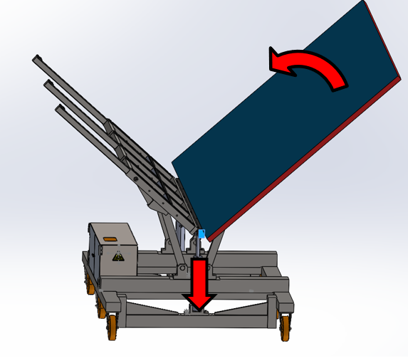 Die Lösung umfasst eine robuste, mobile Vorrichtung mit hydraulischen Antriebssystemen. Die Konstruktion wird vor allem aus Stahl gefertigt, um die erforderliche Festigkeit und Langlebigkeit zu gewährleisten. Als Oberflächenschutz dient ein PVC-Kunststoffschutz der Kontaktflächen, die die Platte vor Kratzern schützt und eine schonende Handhabung ermöglicht. Zusätzlich sorgt die stabile Konstruktion für hohe Sicherheit im gesamten Betrieb. Der Einsatz von zwei Hydraulikzylindern erlaubt es, die Platten in nur 60 Sekunden zu wenden, was den Prozess erheblich beschleunigt und die Effizienz steigert.