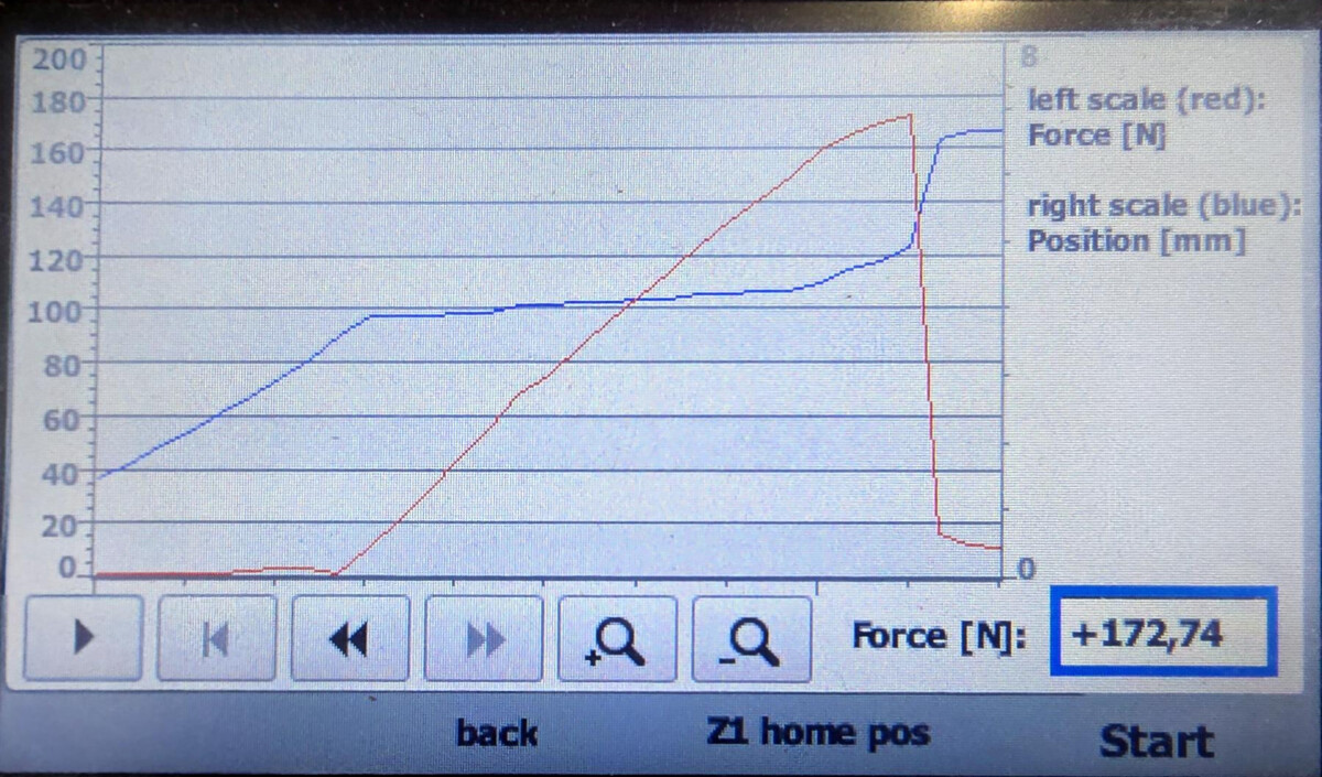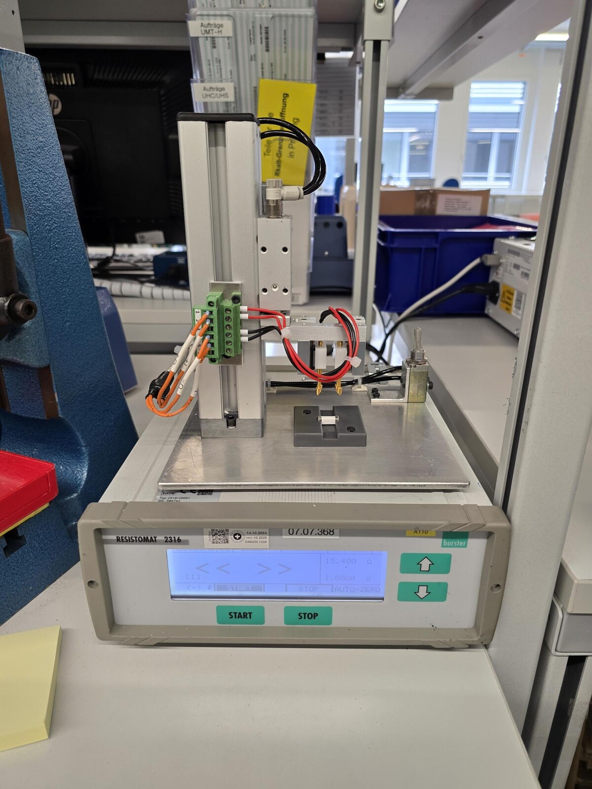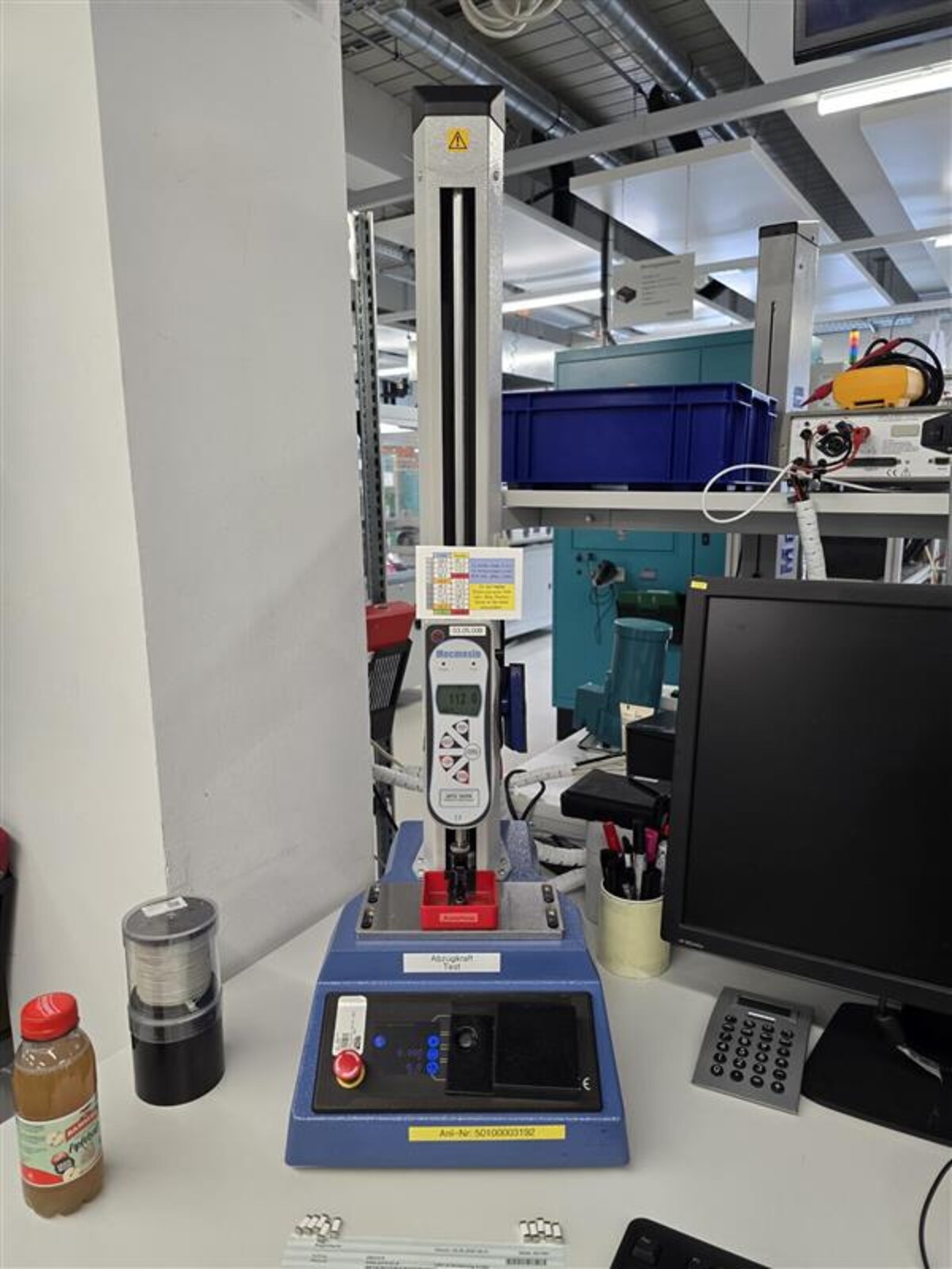 Bei dem Pull-Off force Prozess werden zwei Kappen von einem Gehäuse gezogen. Die Kappen sind auf ein Keramikghäuse gelötet. Während des Prozesses wird die maximale Kraft, mittels Kraftmessdose, gemessen.
