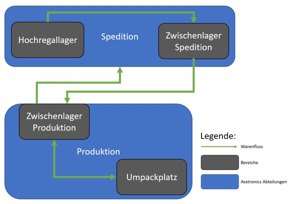 Der neue Warenflussplan ist erarbeitet und beinhaltet einen neuen manuellen Umpackprozess, der unabhängig von der Losgrösse ist. Zusätzlich wurden zwei neue Zwischenlager gefunden und definiert, um die grossen Umlaufmengen zu meistern.