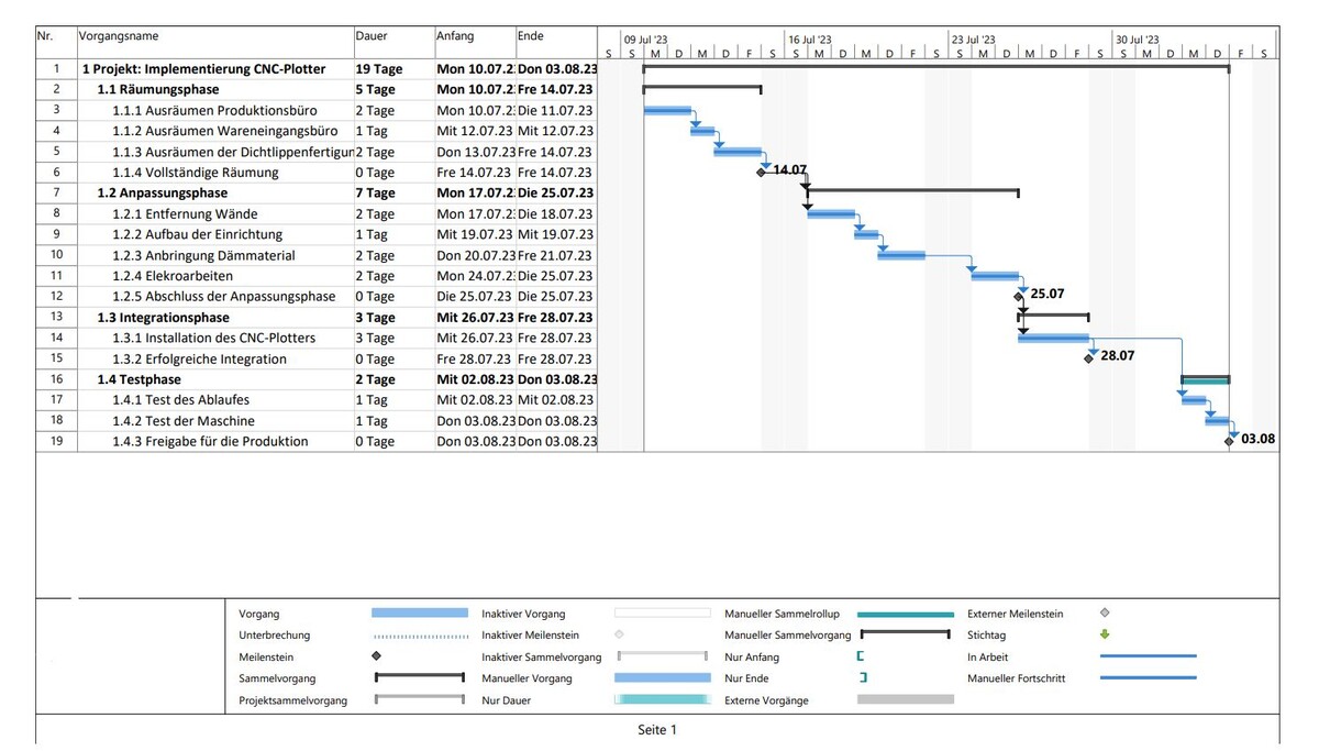 - Termingerechte Umsetzung: Der CNC-Plotter wird bis zum vorgegebenen Datum, dem 18.08.2023, einsatzbereit gemacht, wobei der Fokus darauf liegt, dass die Maschine effektiv produktiv arbeitet.