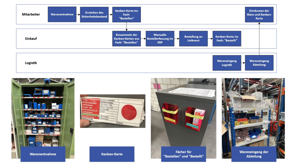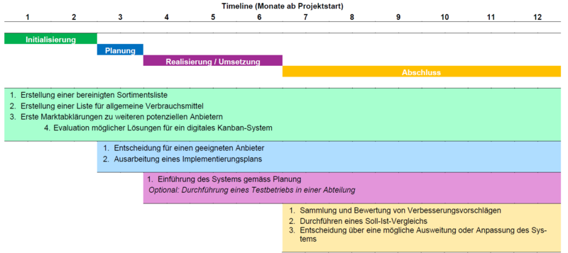 Empfohlen wird die Einführung eines digitalen Kanban-Systems als Ersatz für das bisherige analoge System – mit Ausweitung auf weitere relevante Bereiche. Gestartet werden sollte mit einem Testbetrieb in einer ausgewählten Abteilung. Eine gezielte Sortimentsbereinigung sowie klar definierte Zuständigkeiten bilden die Basis für den Erfolg.