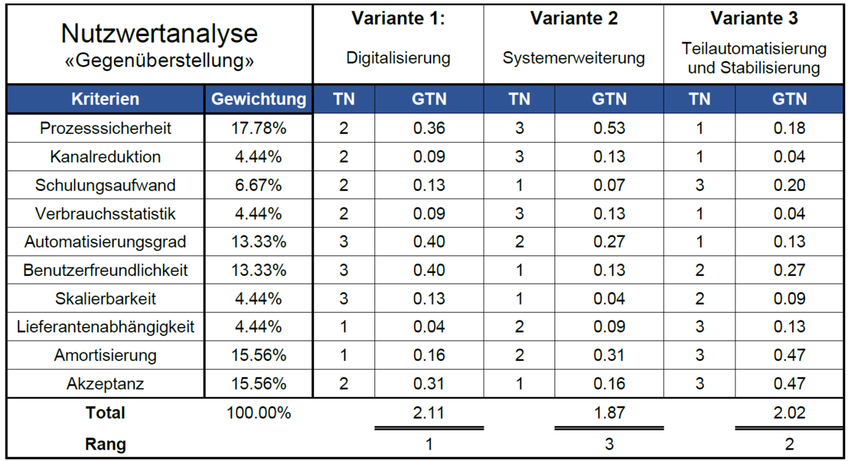 Die favorisierte Digitalisierungsvariante schnitt in sämtlichen Bewertungsverfahren (Nutzwertanalyse, Sensitivitätsprüfung) am besten ab. Sie überzeugt durch Skalierbarkeit, reduzierte manuelle Aufwände und automatisierte Nachschubbeschaffung.