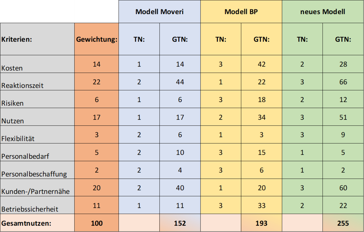 Da der Entscheid, welches Modell künftig verfolgt werden soll, nicht ausschliesslich über die Kosten definiert wird, wurden die Modelle in einer Nutzwertanalyse bewertet. Die angewandten Kriterien gewichtete ich zuvor in einer Präferenzmatrix. Es wundert wenig, dass die neue Mischform als Sieger auserkoren wurde. Vereint sie doch vorwiegend positive Aspekte der beiden "alten" Modelle.