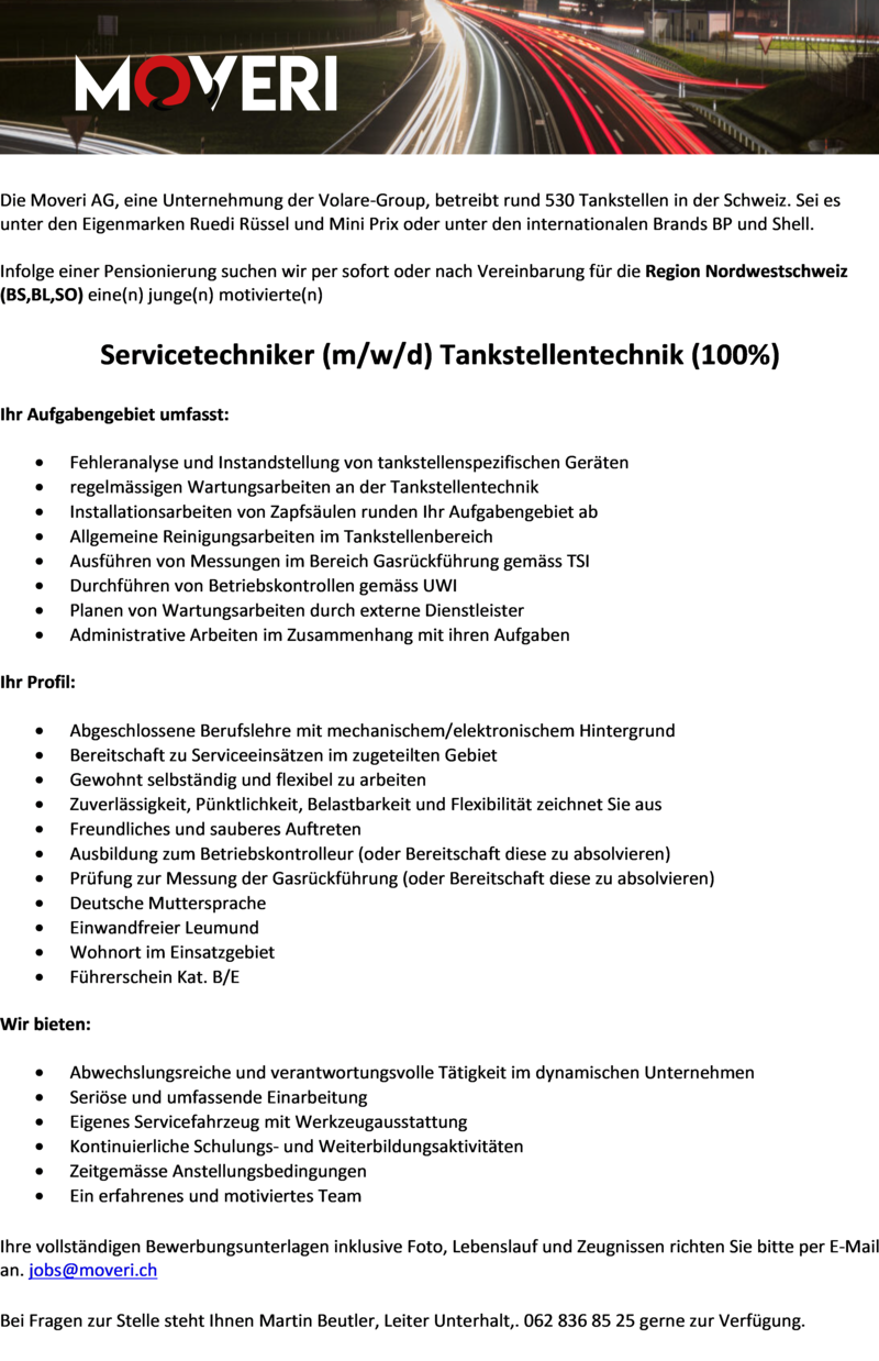 In einem rückläufigen Treib- und Brennstoffmarkt sind Zusammenschlüsse, mit daraus resultierenden Synergien, die logische Folge. Um auch künftig ein attraktiver Partner für flüssige Energieträger bei Wärme und Mobilität zu sein, hat die ebenfalls zur Volare Group gehörende Oel-Pool AG, per 01.04.2022 die Aktivitäten der BP Schweiz übernommen. Im Rahmen dieser Übernahme treffen zwei komplett unterschiedliche Unterhaltsphilosophien im Bereich Tankstellenbetrieb aufeinander. Während die Moveri AG mit unternehmenseigenen Techniker agiert, sind bei BP Schweiz sämtliche Unterhaltsarbeiten an externe Dienstleister ausgelagert.