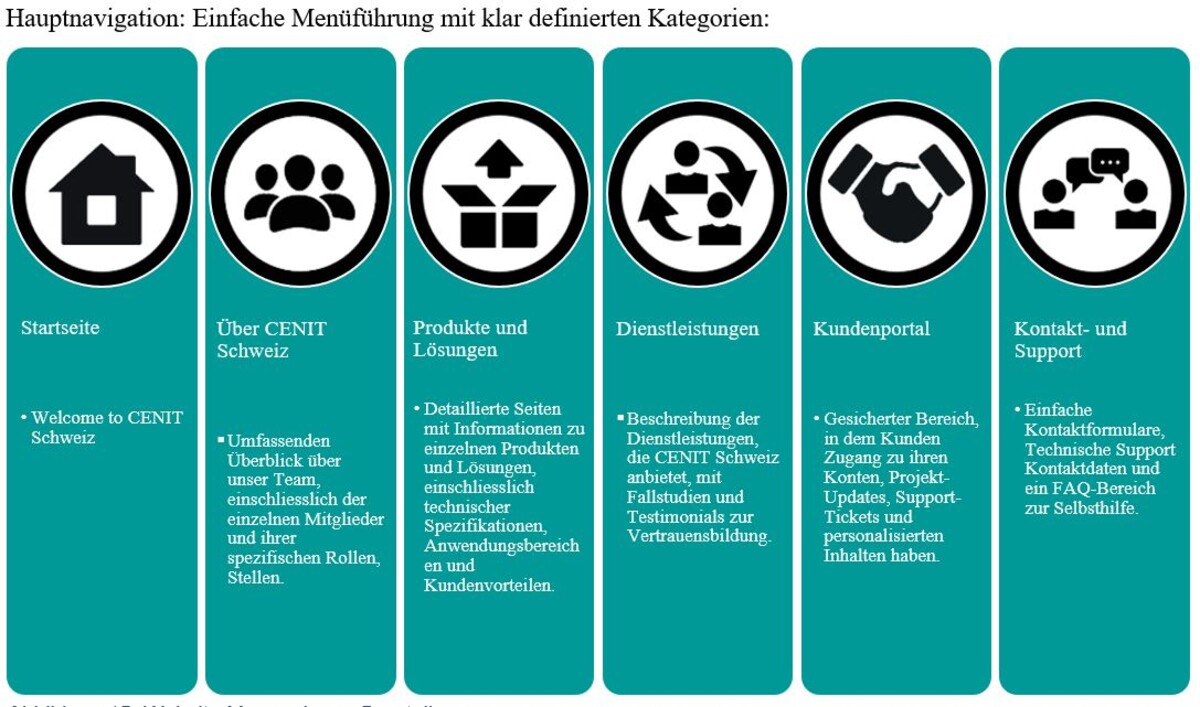 Bislang verfügt CENIT Schweiz über keine eigenständige Website und ist auf der globalen Plattform von CENIT als Landesorganisation kaum repräsentiert, was die lokale Sichtbarkeit und Interaktion mit den Kunden deutlich einschränkt. Die Problemanalyse hat aufgezeigt, dass es an einer Schweiz spezifischen Website mangelt. Die Diplomarbeit setzt sich zum Ziel, diese Lücke zu schliessen, indem sie eine Website Konzept entwickelt, die gezielt auf die Bedürfnisse des Schweizer Marktes eingeht.