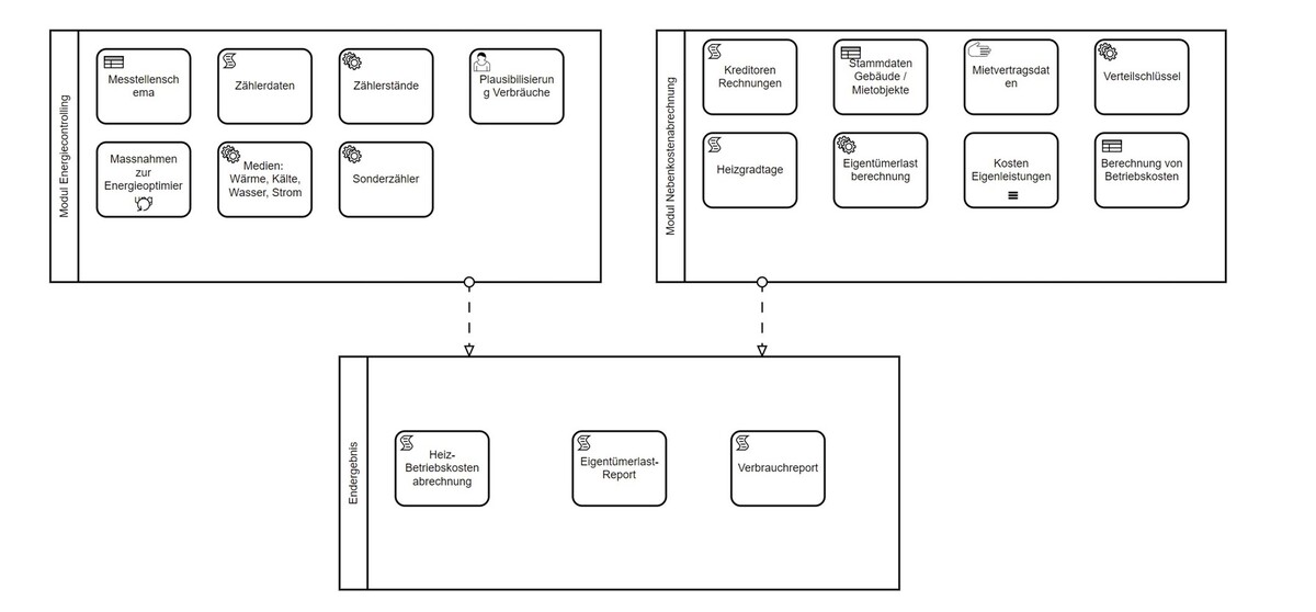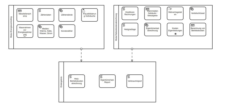 Bei SBB Immobilien werden die Heiz- und Betriebskostenabrechnungen für die Grossbahnhöfe Basel SBB, Bern, Luzern, Genf-Cornavin und Zürich HB verantwortet. Diesen Abrechnungen liegen aufgrund der Vielzahl verschiedener Nutzungen der Mietflächen, sowie der komplexen Gebäudetechnik und den daraus resultierenden Kostenverteilungen sowie Zähler für verschiedene Medien komplexe Verteilschlüssel zugrunde. Seit rund 25 Jahren werden diese Prozesse in der selbst entwickelten Softwarelösung «WinBNKA» abgehandelt. Diese Software ist per Ende 2023 endgültig End of Life und kann nachher definitiv nicht mehr verwendet werden. Eng damit verknüpft ist das Energiecontrolling, welches ebenfalls optimiert werden soll. Das Energiecontrolling betrifft die Kontrolle und Plausibilisierung der Medienverbräuche (Wasser, Strom, Kälte und Wärme). Aktuell werden die Zählerstände maximal monatlich erhoben, Abweichungen können nur schwer oder gar nicht nachvollzogen werden. Dieser Aspekt soll in Zukunft automatisiert und mit regelmässigeren Daten verbessert werden. Im Rahmen dieser Diplomarbeit soll eine Nachfolgelösung für "WinBNKA" gefunden werden, welche rechtzeitig einsatzbereit ist und den gesamten Prozessdurchlauf zukunftssicher verbessert.