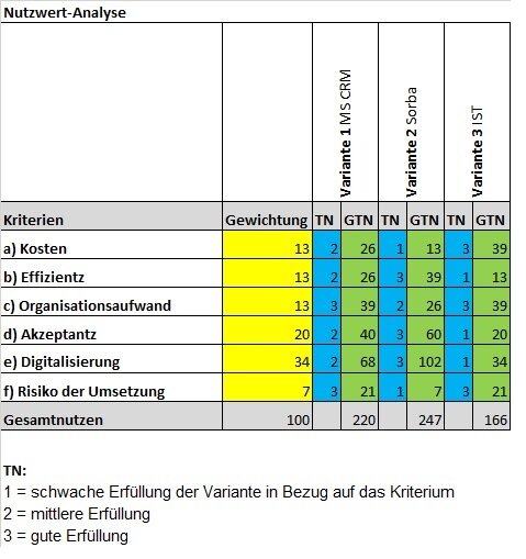 Bei der Lösungsfindung bin ich auf zwei verschiedene Softwarelösungen gestossen. Das Ziel muss sein, alle bestehenden Softwarelösungen sowie Schnittstellen zu eliminieren und den ganzen Workflow zu automatisieren. Nach der Analyse mit einer Präferenzmatrix sowie Nutzwertanalyse ergab sich die eine, logische Lösung. Belegt wurde die Investition in diese Lösung mit einer Kosten-Nutzenanalyse.