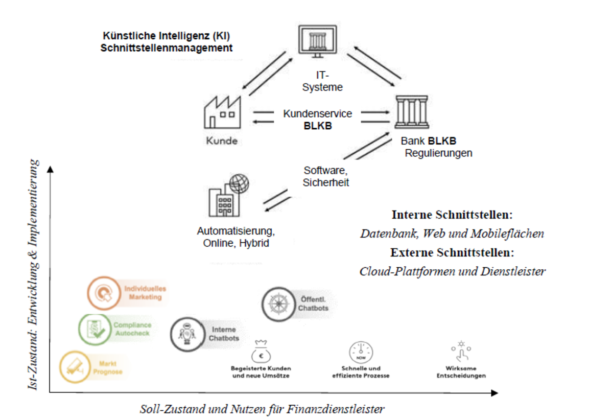 Ausgangslage: Die Basellandschaftliche Kantonalbank (BLKB) ist als führende Regionalbank der Schweiz bestrebt, den Anforderungen einer zunehmend digitalisierten Welt gerecht zu werden. Angesichts des rasanten technologischen Fortschritts und veränderten Kundenbedürfnissen steht die BLKB vor der Aufgabe, ihren Kundenservice kontinuierlich weiterzuentwickeln. Kunden erwarten heute schnelle, personalisierte und reibungslose Interaktionen, die über traditionelle Kommunikationskanäle hinausgehen. Bestehende Projekte: Um den Kundenservice effizienter und moderner zu gestalten, hat die BLKB bereits verschiedene Digitalisierungsprojekte umgesetzt. Dazu zählen die Einführung von Online-Banking-Angeboten und mobilen Apps. Zudem hat die Bank erste Technologien wie automatisierte Prozesse von Routineaufgaben eingeführt. So ist die Bank auch ausserhalb der Geschäftszeiten erreichbar und bietet einen zuverlässigen Service an. Dennoch gibt es weitere Möglichkeiten, den Einsatz von Künstlicher Intelligenz auszubauen, um eine noch individuellere Kundenbetreuung zu gewährleisten und die Effizienz im Servicebereich weiter zu steigern.
