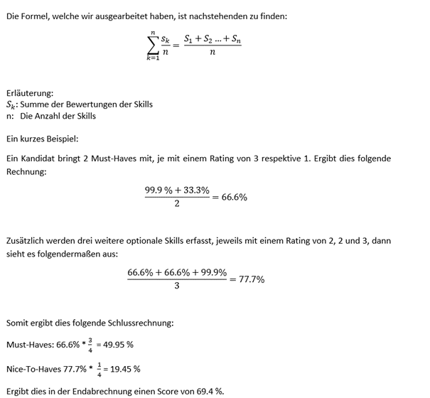 Nachdem das Grundgerüst stand, konnte ich mich dem Matching widmen. Auf Basis der neuen Klassen-Struktur, entwickelte ich eine neue Formel, welche dazu beiträgt, den Matching-Prozess effizienter zu gestalten. Ein neuer wichtiger Bestandteil des Matchings ist, dass die Fertigkeiten der Kandidat*innen bewertet werden können. Dies hat grossen Einfluss auf die Suche nach dem optimalen Profil.
