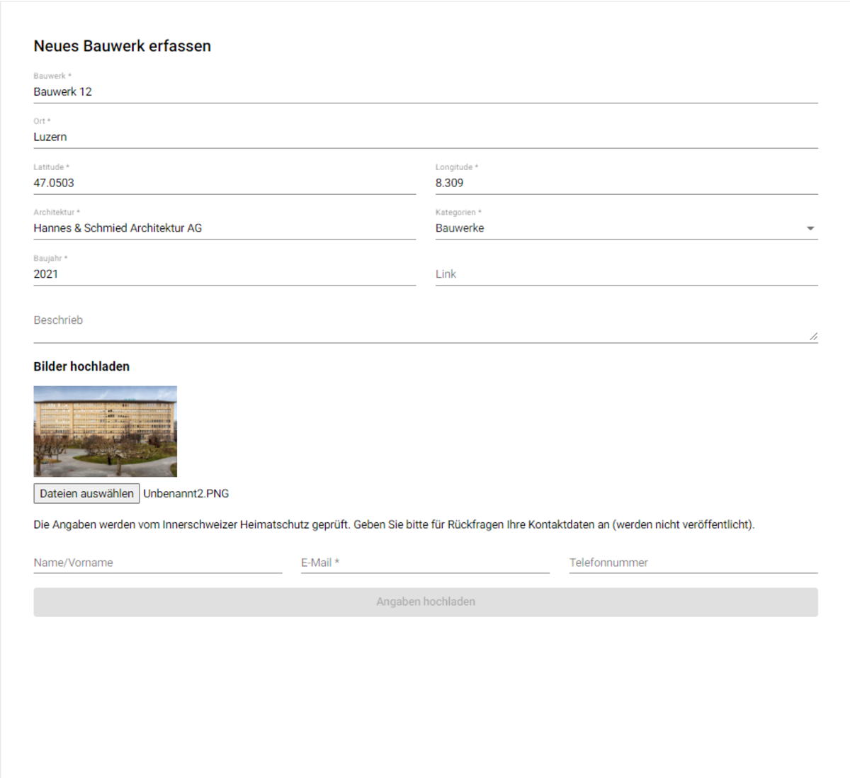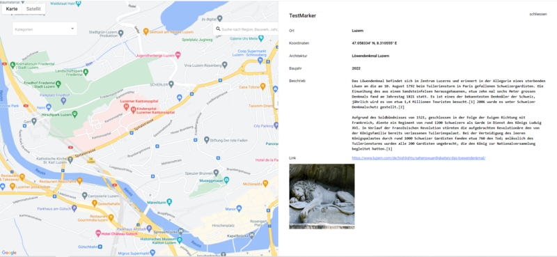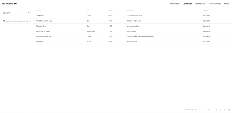 In diesem Projekt steht eine interaktive Karte der Zentralschweiz im Mittelpunkt und soll als Wissensplattform dienen. Ziel dieses Projektes ist es, eine Webapplikation mit einer Übersicht von architektonisch-interessanten Bauten zu entwickeln. Damit die Anforderungen erfüllt sind und die Umsetzung der Software zur Zufriedenheit des Auftragsstellers möglich ist, stellte die IHS Mockups / Sketches zur Verfügung. Nebst den Funktionen wie Filter und Suche der einzelnen Objekte ist eine Ansicht von Detailinformationen wie auch der Upload von Bildern Voraussetzung für eine erfolgreiche Umsetzung.