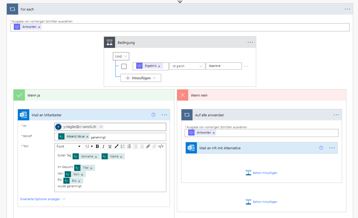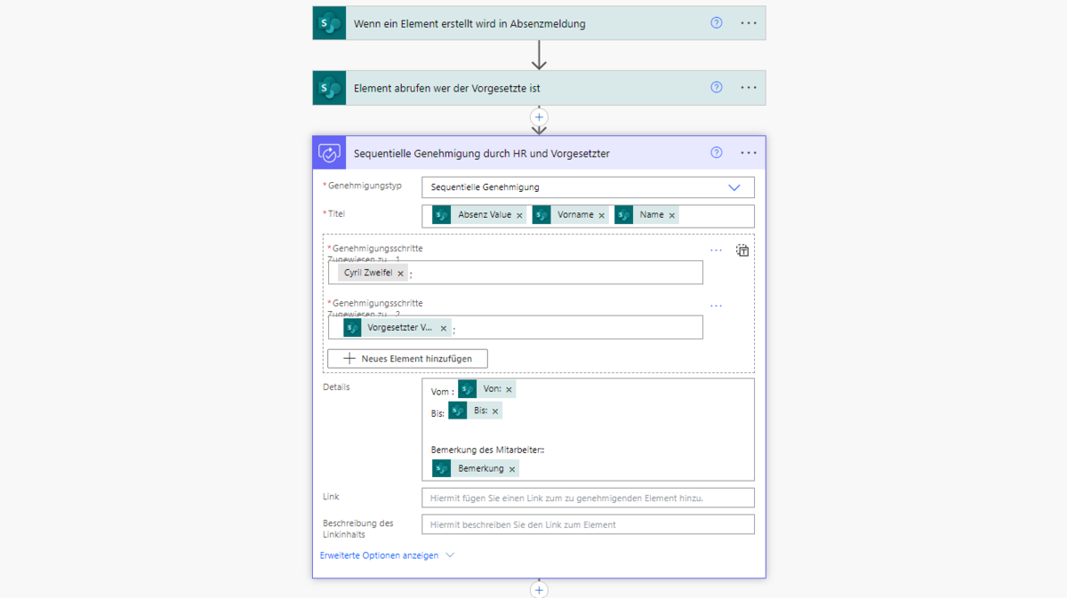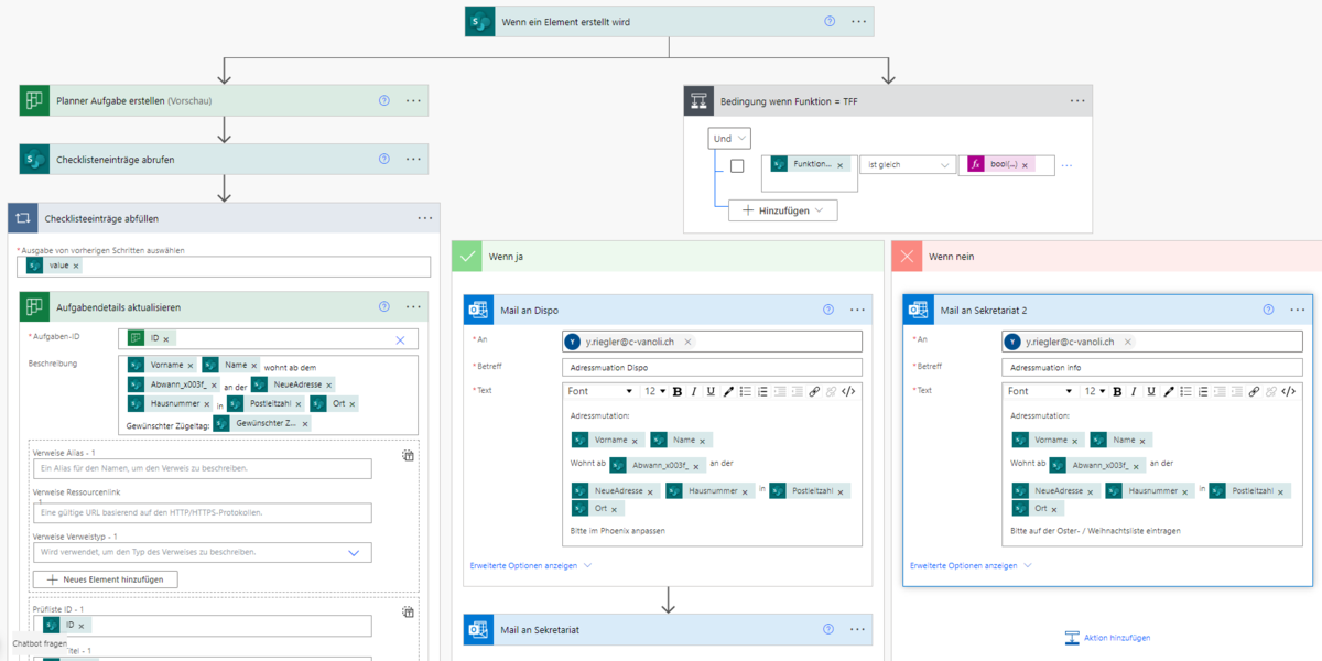 Die Workflows wurden mit den Tools Power Automate und Microsoft Forms digitalisiert. Power Automate wurde verwendet, um die automatisierten Workflows zu erstellen und die Aufgaben sowie Benachrichtigungen an die zuständigen Instanzen zu verteilen. So werden nun beispielsweise Informationen zu Absenzmeldungen oder Adressänderungen automatisch verarbeitet und weitergeleitet. Für das UI haben wir uns für die benutzerfreundliche Variante mittels Microsoft Forms entscheiden.