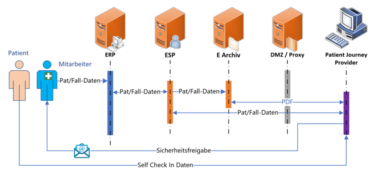 Das ERP fungiert als führendes System und vergibt systemweite Patienten- (PID) und Fallnummern (FID). Die Self-Check-in-Funktion der App ermöglicht es Patienten, vor dem Aufenthalt Daten zu übermitteln, die von der Bettendisposition überprüft und übernommen werden.