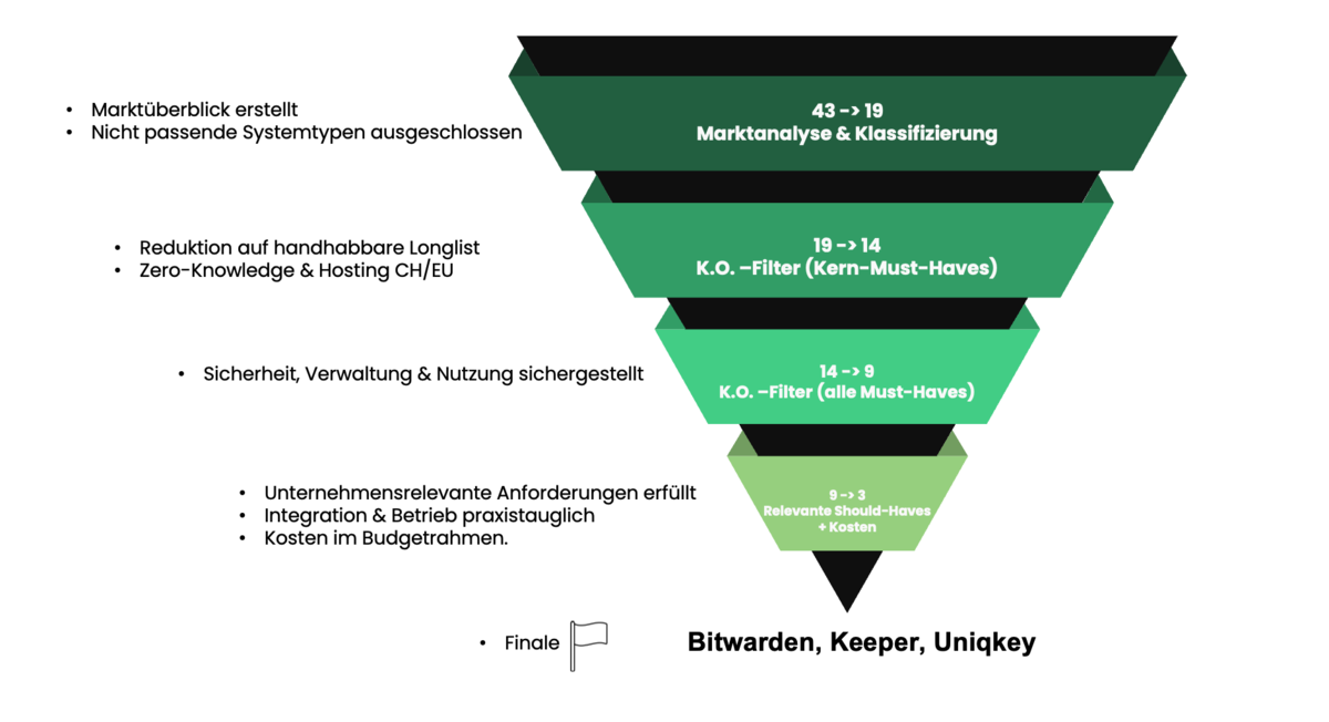 Ausgehend von einem im Pflichtenheft definierten Kriterienkatalog mit Muss- und Soll-Anforderungen sowie einer Analyse der relevanten Prozesse und Bedürfnisse wurde ein mehrstufiges Bewertungsverfahren durchgeführt. Das Bewertungsmodell wurde spezifisch auf die organisatorischen, technischen und sicherheitsrelevanten Anforderungen der login Berufsbildung AG ausgerichtet. Dieses umfasste mehrere Filterstufen, die systematische Eingrenzung der Marktangebote, einen Variantenvergleich der Lösungen Bitwarden, Keeper und Uniqkey sowie eine Präferenz- und Nutzwertanalyse.