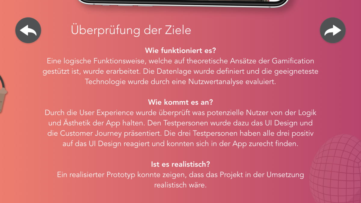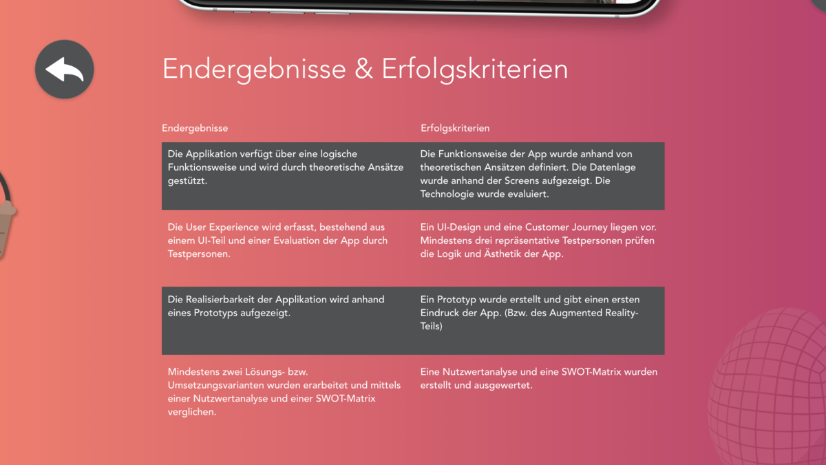Die Realisierung startet mit einem Theorieteil, welcher als Grundlage für die Idee der App dient. Nach einer Anforderungsanalyse wird die Logik der App anhand von Screens erläutert. Nachdem die interne und externe Datenlage bestimmt wird, folgt eine Evaluierung der Technologie, welche sich für das Projekt am besten eignet. Ein weiteres wesentliches Kapitel handelt von der User Experience, wo unter anderem die Meinung und Akzeptanz von Testpersonen erfragt wird. Im Kapitel «Realisierung eines Prototyps» soll ein Bestandteil der Augmented Reality-Erfahrung umgesetzt werden, um die Realisierbarkeit der Idee zu ermitteln. Vor dem Abschluss der Arbeit werden einige mögliche Umsetzungsvarianten diskutiert.