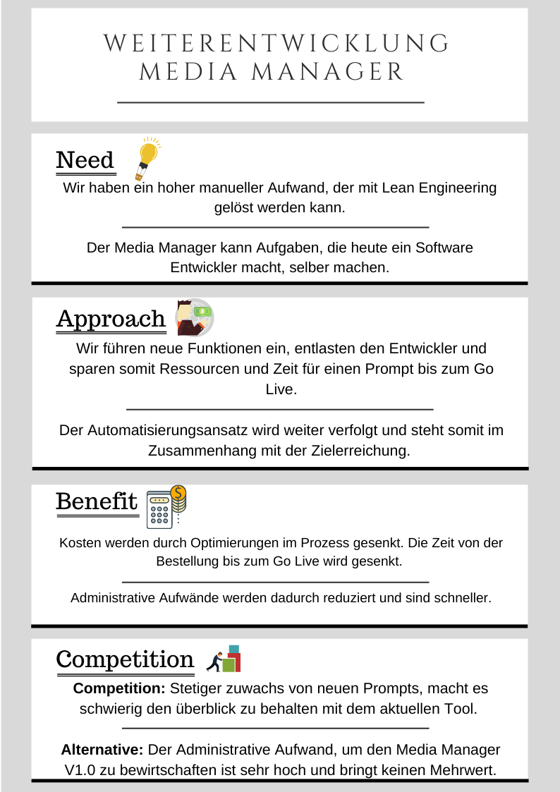 Die Customer Interaction ART betreibt und entwickelt mit der Swisscom Contact Center Plattform die grössten Kontaktkanäle der Swisscom weiter, indem sie (BIZDEVOPS) in einem agilen Setup den kompletten Value Stream verantworten und somit operational Excellence und beste Kundenerlebnisse ermöglichen. So wurde auch der Media Manager als Eigenentwicklung entwickelt. In dieser Diplomarbeit habe ich eine Handlungsempfehlung für das weitere Vorgehen geschrieben. Mittels des TEKO 4 Phasenmodells wurde das Thema erarbeitet. Auftraggeber der Diplomarbeit ist mein Fachbetreuer, welcher mir aber die gesamte Freiheit über den Umfang und den Inhalt lies.